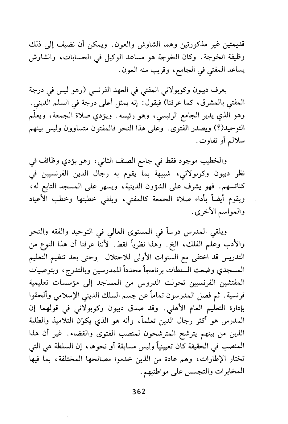 ويلقي المدرس درسا في المستوى العالي في التوحيد والفقه والنحو والأدب وعلم الفلك، الخ، وهذا نظريا فقط، لأننا عرفنا أن هذا النوع من التدريس قد اختفى مع السنوات الأولى للاحتلال، وحتى بعد تنظيم التعليم المسجدي وضعت السلطات برنامجا محددا للمدرسين وبالتدرج، وبتوصيات المفتشين الفرنسيين تحولت الدروس من المساجد إلى مؤسسات تعليمية فرنسية، ثم فصل المدرسون تماما عن جسم السلك الديني الإسلامي وألحقوا بإدارة التعليم العام الأهلي، وقد صدق ديبون وكوبولاني في قولهما إن المدرس هو أكثر رجال الدين تعلما، وأنه هو الذي يكون التلاميذ والطلبة الذين من بينهم يترشح المترشحون لمنصب الفتوى والقضاء، غير أن هذا المنصب في الحقيقة كان تعيينيا وليس مسابقة أو نحوها، إن السلطة هي التي تختار الإطارات، وهم عادة من الذين خدموا مصالحها المختلفة، بما فيها المخابرات والتجسس على مواطنيهم،