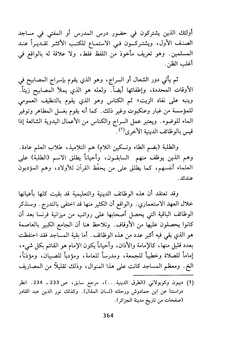 وقد تعتقد أن هذه الوظائف الدينية والتعليمية قد بقيت كلها بأعيانها خلال العهد الاستعماري، والواقع أن الكثير منها قد اختفى بالتدرج، وسنذكر الوظائف الباقية التي يحصل أصحابها على رواتب من ميزانية فرنسا بعد أن كانوا يحصلون عليها من الأوقاف، ونلاحظ هنا أن الجامع الكبير بالعاصمة هو الذي بقي فيه أكبر عدد من هذه الوظائف، أما بقية المساجد فقد احتفظت بعدد قليل منها، كالإمامة والأذان، وأحيانا يكون الإمام هو القائم بكل شيء، إماما للصلاة وخطيبا للجمعة، ومدرسا للعامة، ومؤدبا للصبيان، ومؤذنا، الخ، ومعظم المساجد كانت على هذا المنوال، وذلك تقليلا من المصاريف