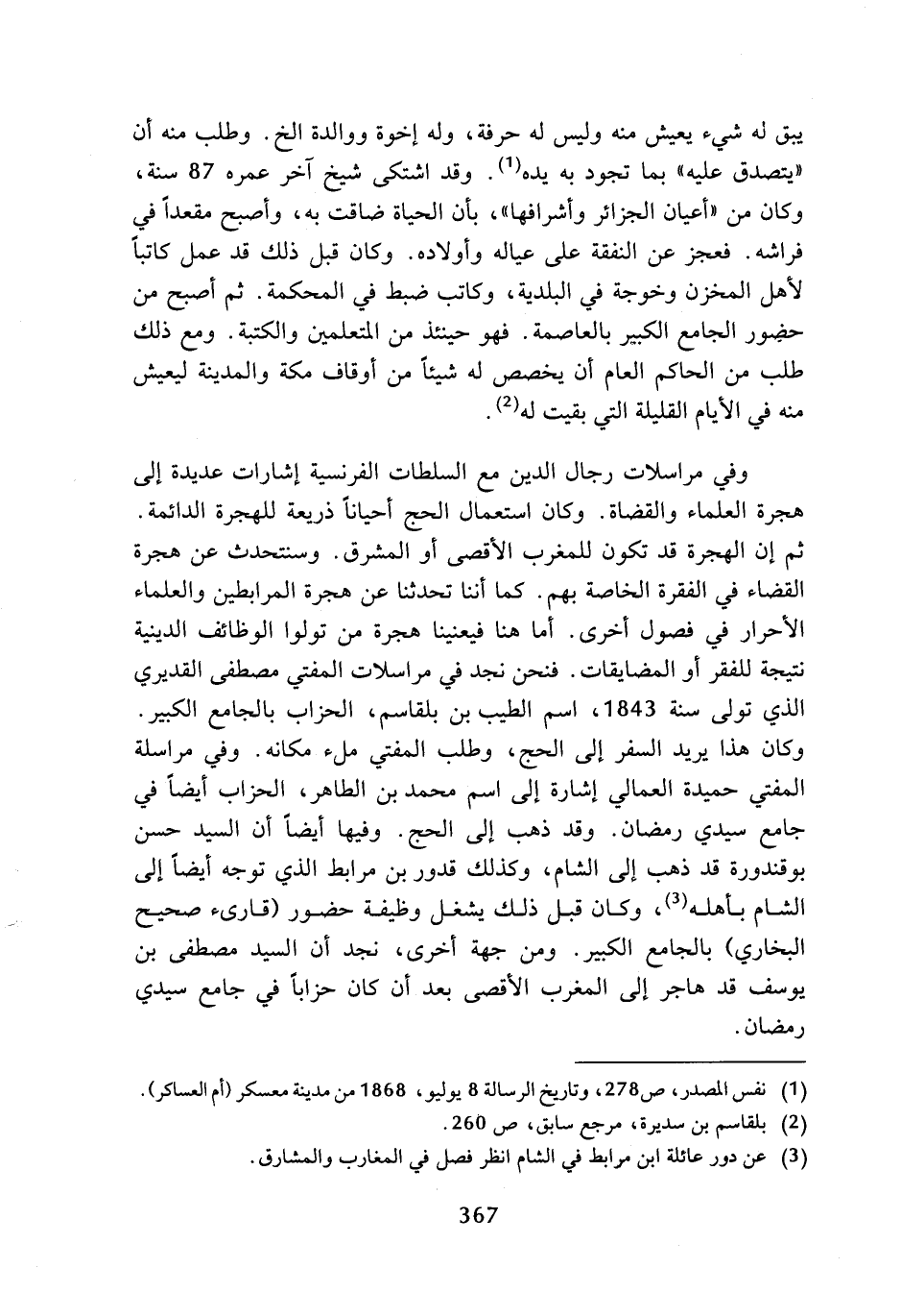 وفي مراسلات رجال الدين مع السلطات الفرنسية إشارات عديدة إلى هجرة العلماء والقضاة، وكان استعمال الحج أحيانا ذريعة للهجرة الدائمة، ثم إن الهجرة قد تكون للمغرب الأقصى أو المشرق، وسنتحدث عن هجرة القضاء في الفقرة الخاصة بهم، كما أننا تحدثنا عن هجرة المرابطين والعلماء الأحرار في فصول أخرى، أما هنا فيعنينا هجرة من تولوا الوظائف الدينية نتيجة للفقر أو المضايقات، فنحن نجد في مراسلات المفتي مصطفى القديري الذي تولى سنة 1843، اسم الطيب بن بلقاسم، الحزاب بالجامع الكبير، وكان هذا يريد السفر إلى الحج، وطلب المفتي ملء مكانه، وفي مراسلة المفتي حميدة العمالي إشارة إلى اسم محمد بن الطاهر، الحزاب أيضا في جامع سيدي رمضان، وقد ذهب إلى الحج، وفيها أيضا أن السيد حسن بوقندورة قد ذهب إلى الشام، وكذلك قدور بن مرابط الذي توجه أيضا إلى الشام باهله (¬3). وكان قبل ذلك يشغل وظيفة حضور (قارئ صحيح البخاري) بالجامع الكبير، ومن جهة أخرى، نجد أن السيد مصطفى بن يوسف قد هاجر إلى المغرب الأقصى بعد أن كان حزابا في جامع سيدي رمضان.