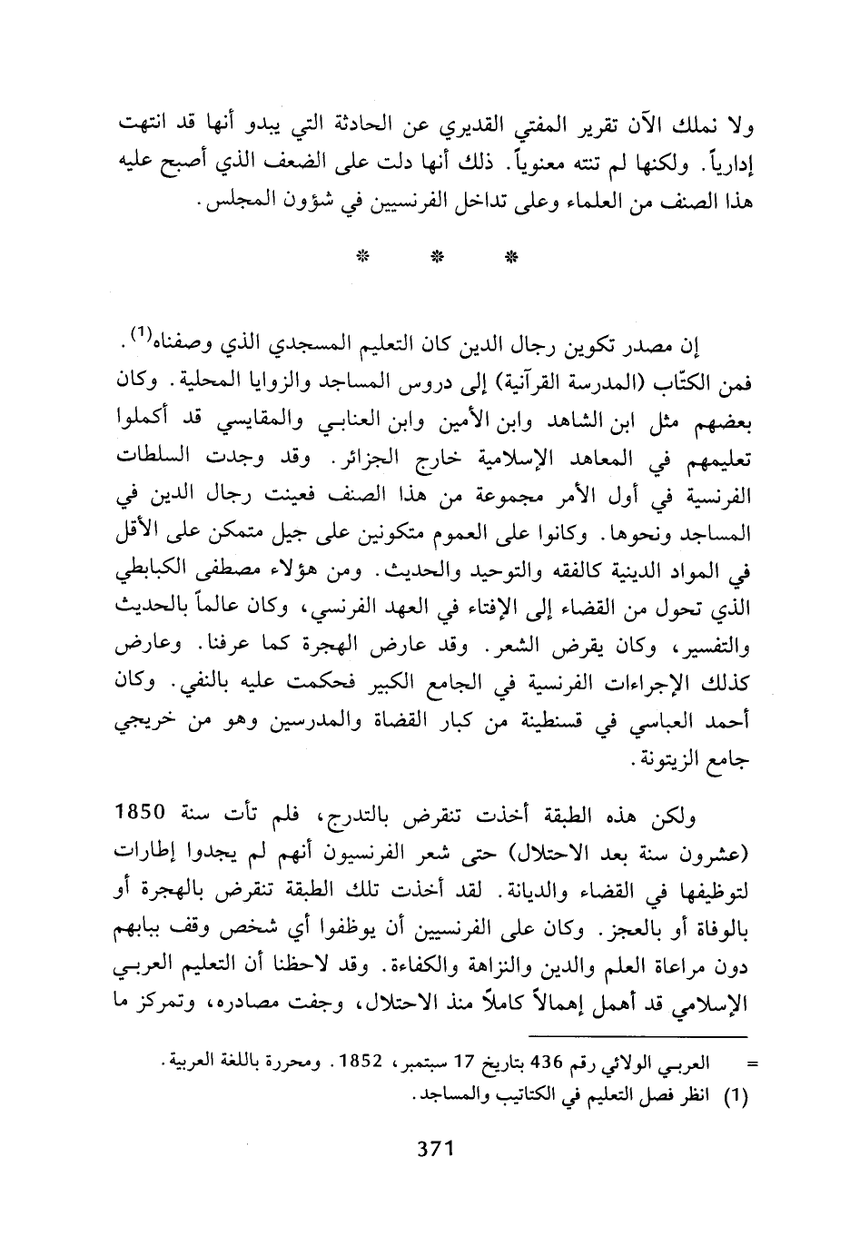 ولا نملك الآن تقرير المفتي القديري عن الحادثة التي يبدو أنها قد انتهت إداريا، ولكنها لم تنته معنويا، ذلك أنها دلت على الضعف الذي أصبح عليه هذا الصنف من العلماء وعلى تداخل الفرنسيين في شؤون المجلس.