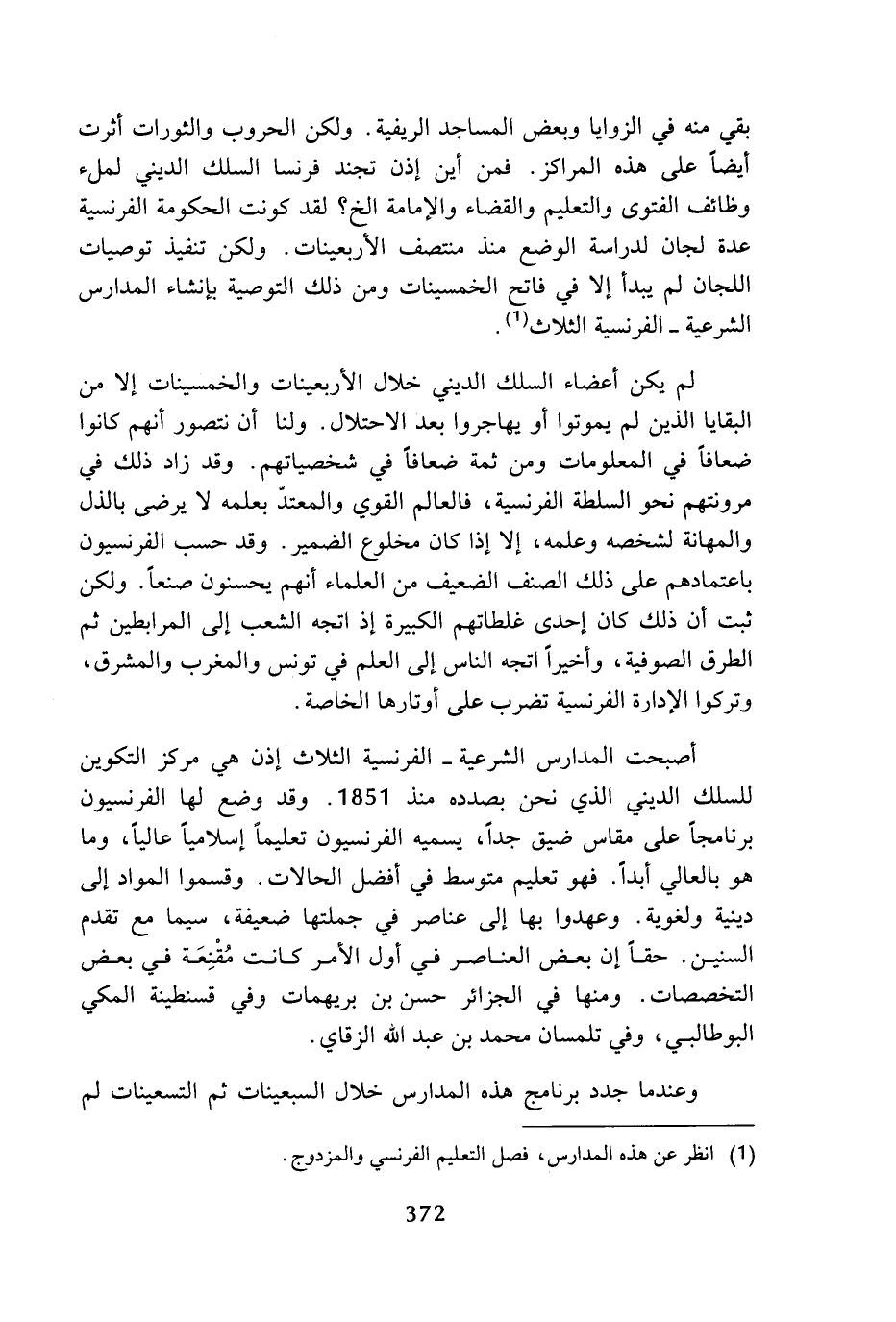 بقي منه في الزوايا وبعض المساجد الريفية، ولكن الحروب والثورات أثرت أيضا على هذه المراكز، فمن أين إذن تجند فرنسا السلك الديني لملء وظائف الفتوى والتعليم والقضاء والإمامة الخ؟ لقد كونت الحكومة الفرنسية عدة لجان لدراسة الوضع منذ منتصف الأربعينات، ولكن تنفيذ توصيات اللجان لم يبدأ إلا في فاتح الخمسينات ومن ذلك التوصية بإنشاء المدارس الشرعية - الفرنسية الثلاث (¬1).