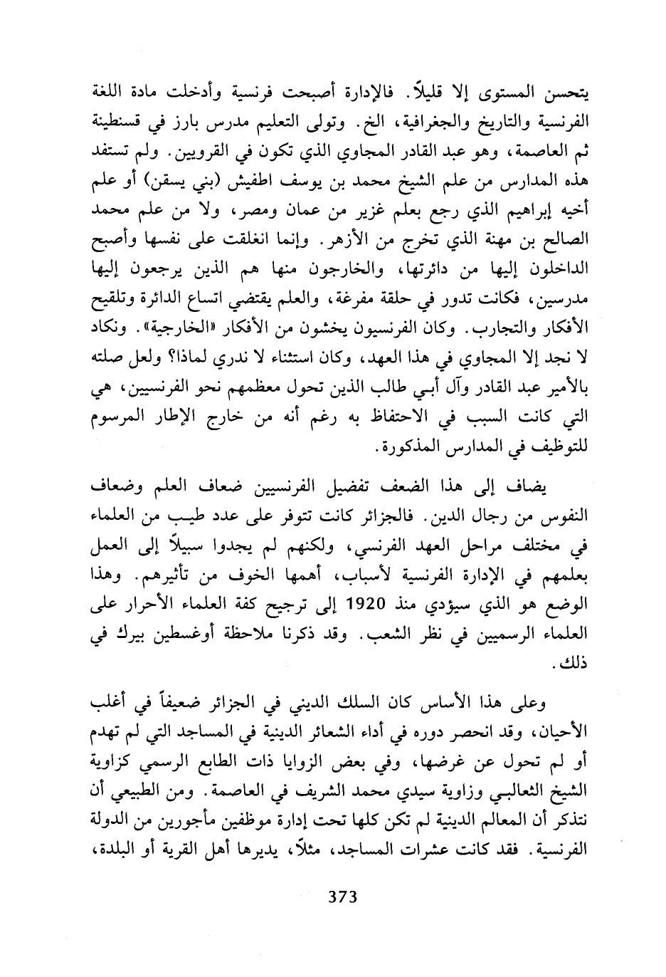 يضاف إلى هذا الضعف تفضيل الفرنسيين ضعاف العلم وضعاف النفوس من رجال الدين، فالجزائر كانت تتوفر على عدد طيب من العلماء في مختلف مراحل العهد الفرنسي، ولكنهم لم يجدوا سبيلا إلى العمل بعلمهم في الإدارة الفرنسية لأسباب، أهمها الخوف من تأثيرهم، وهذا الوضع هو الذي سيؤدي منذ 1920 إلى ترجيح كفة العلماء الأحرار على العلماء الرسميين في نظر الشعب، وقد ذكرنا ملاحظة أوغسطين بيرك في ذلك.