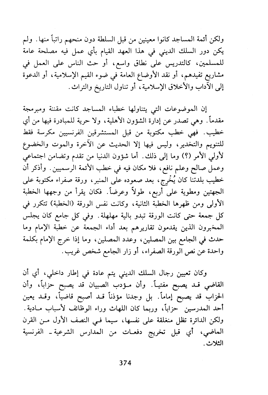 إن الموضوعات التي يتناولها خطباء المساجد كانت مقننة ومبرمجة مقدما، وهي تصدر عن إدارة الشؤون الأهلية، ولا حرية للمبادرة فيها من أي خطيب، فهي خطب مكتوبة من قبل المستشرقين الفرنسيين مكرسة فقط للتنويم والتخدير، وليس فيها إلا الحديث عن الآخرة والموت والخضوع لأولي الأمر (؟) وما إلى ذلك، أما شؤون الدنيا من تقدم وتضامن اجتماعي وعمل صالح وعلم نافع، فلا مكان فيه في خطب الأئمة الرسميين، وأذكر أن خطيب بلدتنا كان يخرج، بعد صعوده على المنبر، ورقة صفراء مكتوبة على الجهتين ومطوية على أربع، طولا وعرضا، فكان يقرأ من وجهها الخطبة الأولى ومن ظهرها الخطبة الثانية، وكانت نفس الورقة (الخطبة) تتكرر في كل جمعة حتى كانت الورقة تبدو بالية مهلهلة، وفي كل جامع كان يجلس المخبرون الذين يقدمون تقاريرهم بعد أداء الجمعة عن خطبة الإمام وما حدث في الجامع بين المصلين، وعدد المصلين، وما إذا خرج الإمام بكلمة واحدة عن نص الورقة الصفراء، أو زار الجامع شخص غريب.