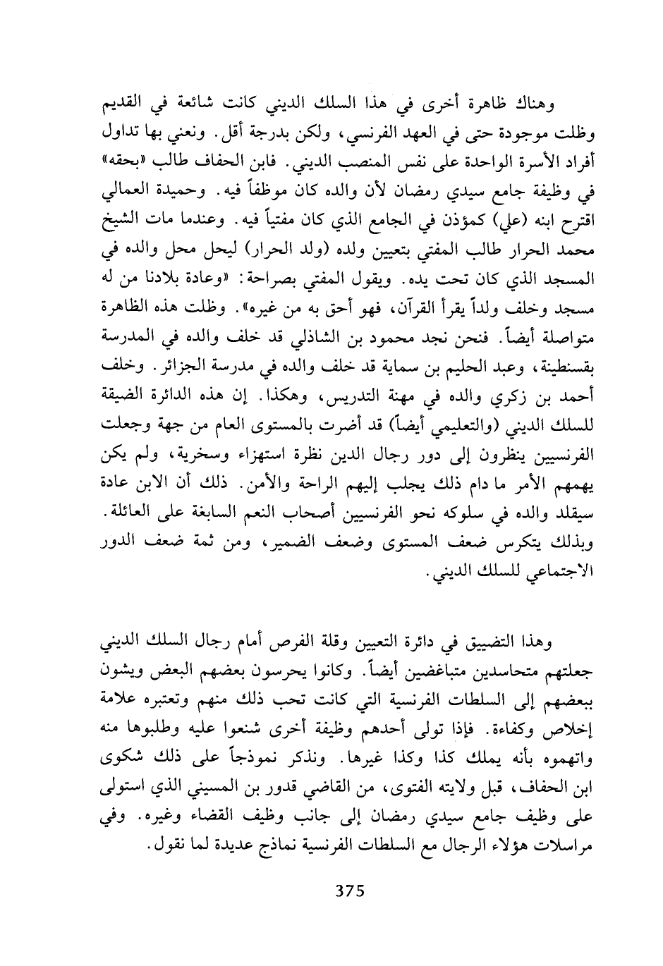 وهناك ظاهرة أخرى في هذا السلك الديني كانت شائعة في القديم وظلت موجودة حتى في العهد الفرنسي، ولكن بدرجة أقل، ونعني بها تداول أفراد الأسرة الواحدة على نفس المنصب الديني، فابن الحفاف طالب (بحقه) في وظيفة جامع سيدي رمضان لأن والده كان موظفا فيه، وحميدة العمالي اقترح ابنه (علي) كمؤذن في الجامع الذي كان مفتيا فيه، وعندما مات الشيخ محمد الحرار طالب المفتي بتعيين ولده (ولد الحرار) ليحل محل والده في المسجد الذي كان تحت يده، ويقول المفتي بصراحة: (وعادة بلادنا من له مسجد وخلف ولدا يقرأ القرآن، فهو أحق به من غيره)، وظلت هذه الظاهرة متواصلة أيضا، فنحن نجد محمود بن الشاذلي قد خلف والده في المدرسة بقسنطينة، وعبد الحليم بن سماية قد خلف والده في مدرسة الجزائر، وخلف أحمد بن زكري والده في مهنة التدريس، وهكذا، إن هذه الدائرة الضيقة للسلك الديني (والتعليمي أيضا) قد أضرت بالمستوى العام من جهة وجعلت الفرنسيين ينظرون إلى دور رجال الدين نظرة استهزاء وسخرية، ولم يكن يهمهم الأمر ما دام ذلك يجلب إليهم الراحة والأمن، ذلك أن الابن عادة سيقلد والده في سلوكه نحو الفرنسيين أصحاب النعم السابغة على العائلة، وبذلك يتكرس ضعف المستوى وضعف الضمير، ومن ثمة ضعف الدور الأجتماعي للسلك الديني.