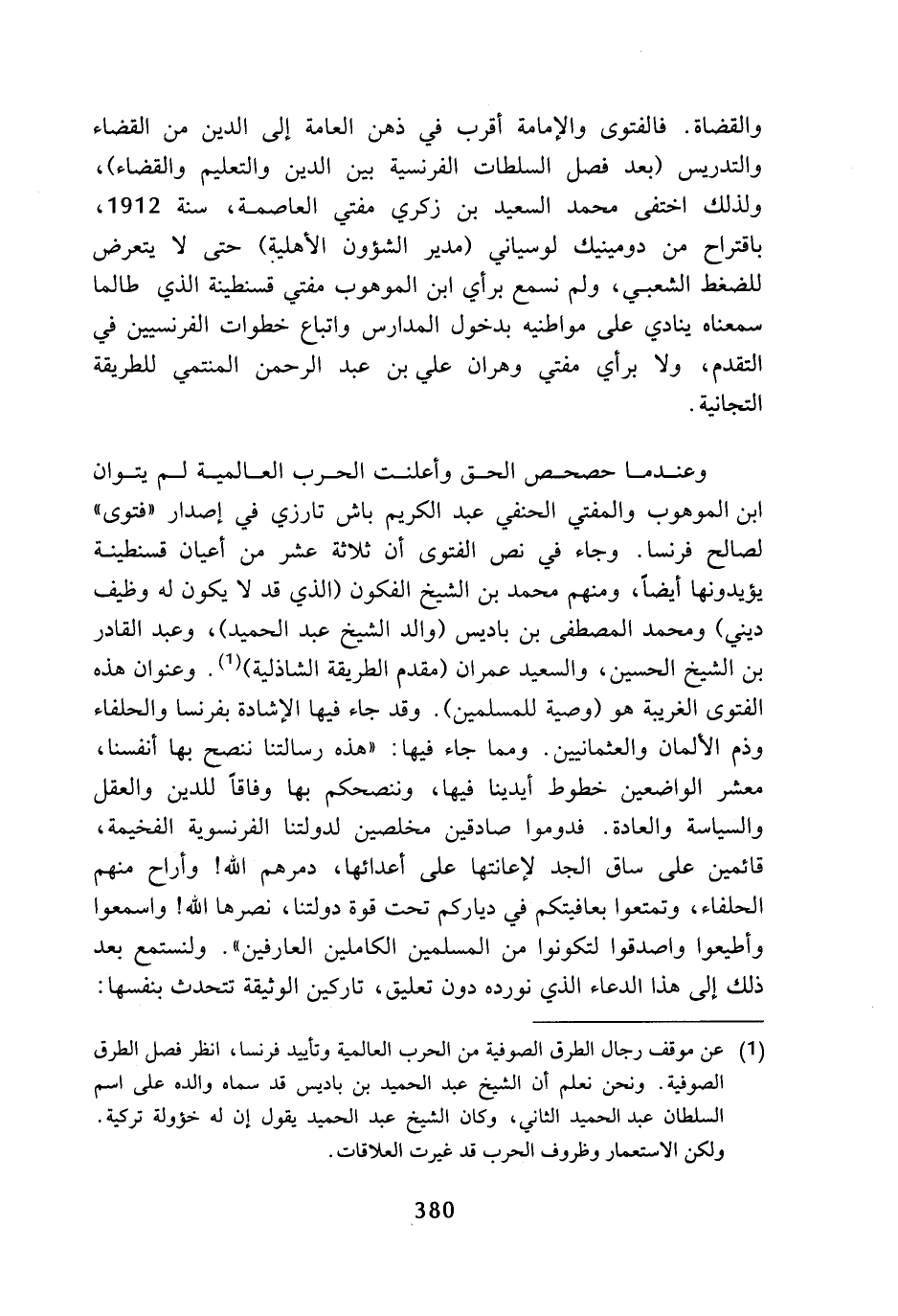 (¬1) عن موقف رجال الطرق الصوفية من الحرب العالمية وتأييد فرنسا، انظر فصل الطرق الصوفية، ونحن نعلم أن الشيخ عبد الحميد بن باديس قد سماه والده على اسم السلطان عبد الحميد الثاني، وكان الشيخ عبد الحميد يقول إن له خؤولة تركية، ولكن الاستعمار وظروف الحرب قد غيرت العلاقات.