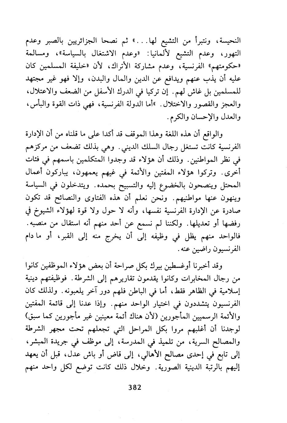والواقع أن هذه اللغة وهذا الموقف قد أكدا على ما قلناه من أن الإدارة الفرنسية كانت تستغل رجال السلك الديني، وهي بذلك تضعف من مركزهم في نظر المواطنين، وذلك أن هؤلاء قد وجدوا المتكلمين باسمهم في فئات أخرى، وتركوا هؤلاء المفتين والأئمة في غيهم يعمهون، يباركون أعمال المحتل وينصحون بالخضوع إليه والتسبيح بحمده، ويتدخلون في السياسة وينهون عنها مواطنيهم، ونحن نعلم أن هذه الفتاوى والنصائح قد تكون صادرة عن الإدارة الفرنسية نفسها، وأنه لا حول ولا قوة لهؤلاء الشيوخ في رفضها أو تعديلها، ولكننا لم نسمع عن أحد منهم أنه استقال من منصبه، فالواحد منهم يظل في وظيفه إلى أن يخرج منه إلى القبر، أو ما دام الفرنسيون راضين عنه.