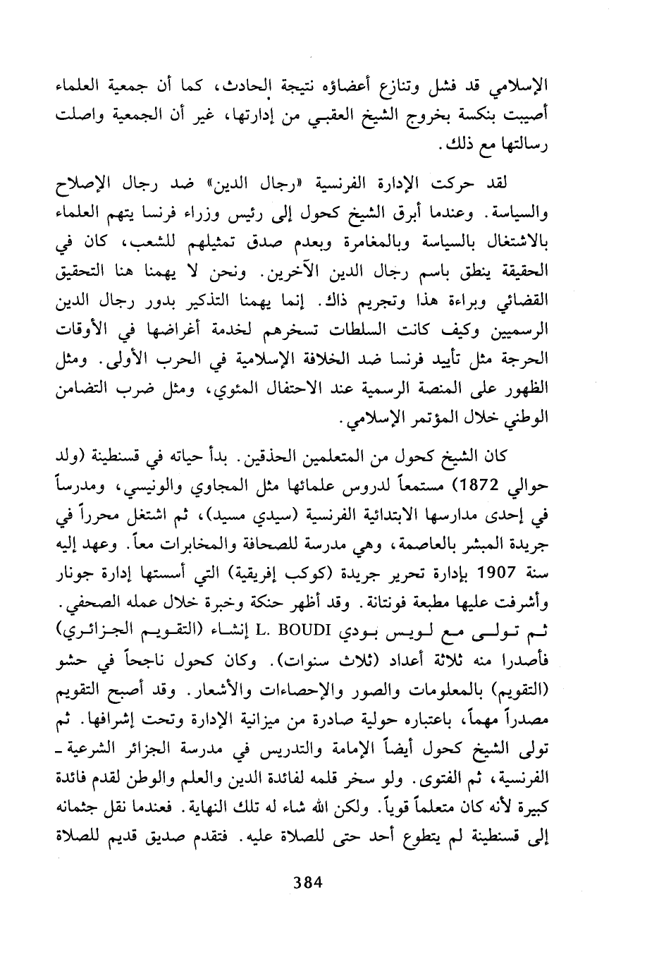 لقد حركت الإدارة الفرنسية (رجال الدين) ضد رجال الإصلاح والسياسة، وعندما أبرق الشيخ كحول إلى رئيس وزراء فرنسا يتهم العلماء بالاشتغال بالسياسة وبالمغامرة وبعدم صدق تمثيلهم للشعب، كان في الحقيقة ينطق باسم رجال الدين الآخرين، ونحن لا يهمنا هنا التحقيق القضائي وبراءة هذا وتجريم ذاك، إنما يهمنا التذكير بدور رجال الدين الرسميين وكيف كانت السلطات تسخرهم لخدمة أغراضها في الأوقات الحرجة مثل تأييد فرنسا ضد الخلافة الإسلامية في الحرب الأولى، ومثل الظهور على المنصة الرسمية عند الاحتفال المئوي، ومثل ضرب التضامن الوطني خلال المؤتمر الإسلامي.