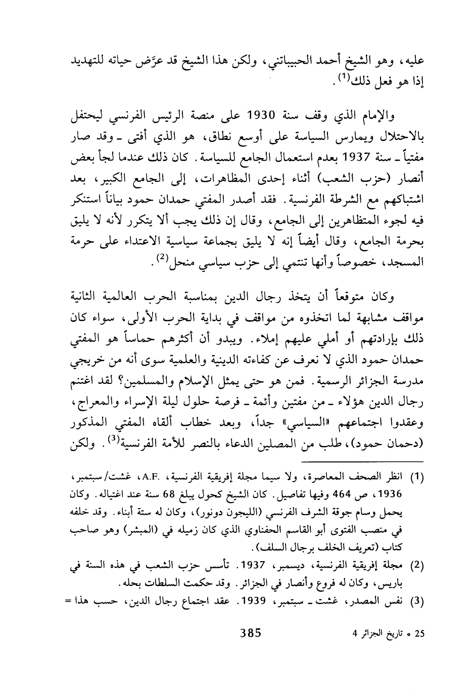 (¬2) مجلة إفريقية الفرنسية، ديسمبر، 1937، تأسس حزب الشعب في هذه السنة في باريس، وكان له فروع وأنصار في الجزائر، وقد حكمت السلطات بحله.