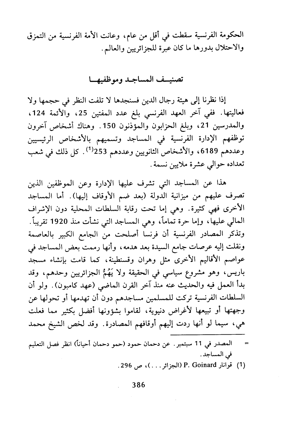 هذا عن المساجد التي تشرف عليها الإدارة وعن الموظفين الذين تصرف عليهم من ميزانية الدولة (بعد ضم الأوقاف إليها). أما المساجد الأخرى فهي كثيرة، وهي إما تحت رقابة السلطات المحلية دون الإشراف المالي عليها، وإما حرة تماما، وهي المساجد التي نشأت منذ 1920 تقريبا، وتذكر المصادر الفرنسية أن فرنسا أصلحت من الجامع الكبير بالعاصمة ونقلت إليه عرصات جامع السيدة بعد هدمه، وأنها رممت بعض المساجد في عواصم الأقاليم الأخرى مثل وهران وقسنطينة، كما قامت بإنشاء مسجد باريس، وهو مشروع سياسي في الحقيقة ولا يهم الجزائريين وحدهم، وقد بدأ العمل فيه والحديث عنه منذ آخر القرن الماضي (عهد كامبون). ولو أن السلطات الفرنسية تركت للمسلمين مساجدهم دون أن تهدمها أو تحولها عن وجهتها أو تبيعها لأغراض دنيوية، لقاموا بشؤونها أفضل بكثير مما فعلت هي، سيما لو أنها ردت إليهم أوقافهم المصادرة، وقد لخص الشيخ محمد