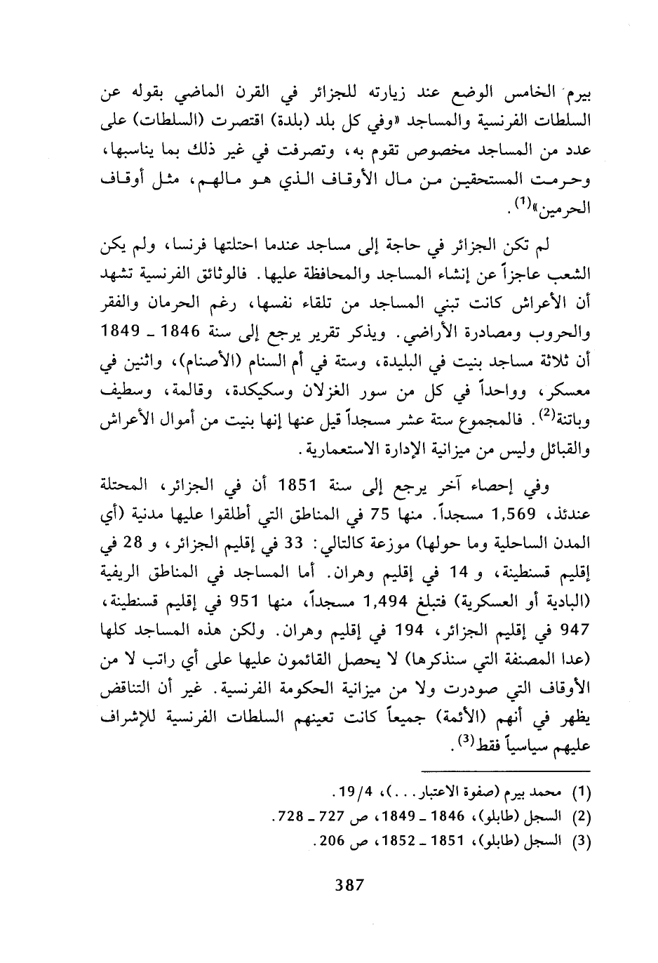 بيرم الخامس الوضع عند زيارته للجزائر في القرن الماضي بقوله عن السلطات الفرنسية والمساجد (وفي كل بلد (بلدة) اقتصرت (السلطات) على عدد من المساجد مخصوص تقوم به، وتصرفت في غير ذلك بما يناسبها، وحرمت المستحقين من مال الأوقاف الذي هو مالهم، مثل أوقاف الحرمين) (¬1).