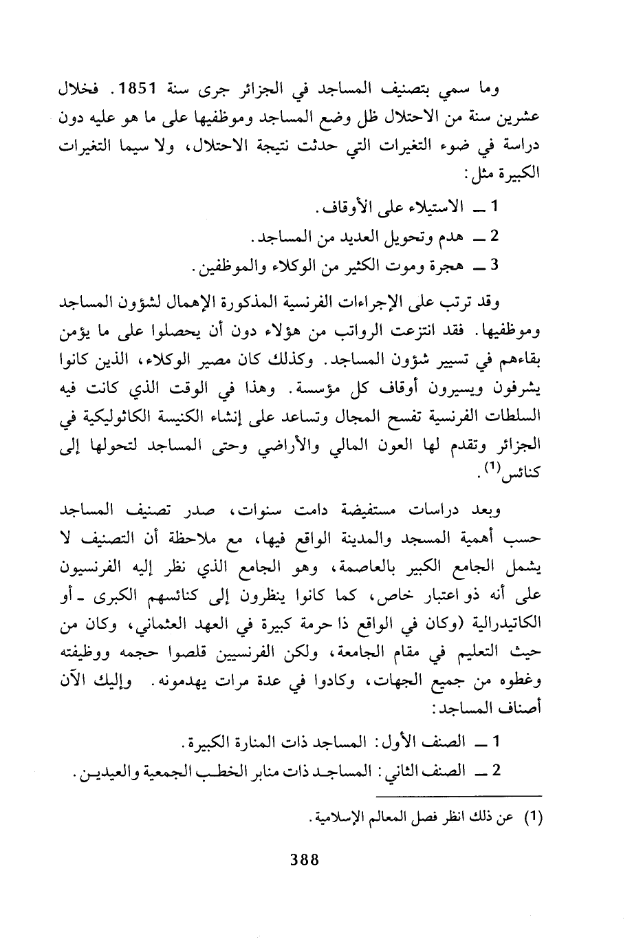 وما سمي بتصنيف المساجد في الجزائر جرى سنة 1851. فخلال عشرين سنة من الاحتلال ظل وضع المساجد وموظفيها على ما هو عليه دون دراسة في ضوء التغيرات التى حدثت نتيجة الاحتلال، ولا سيما التغيرات الكبيرة مثل: