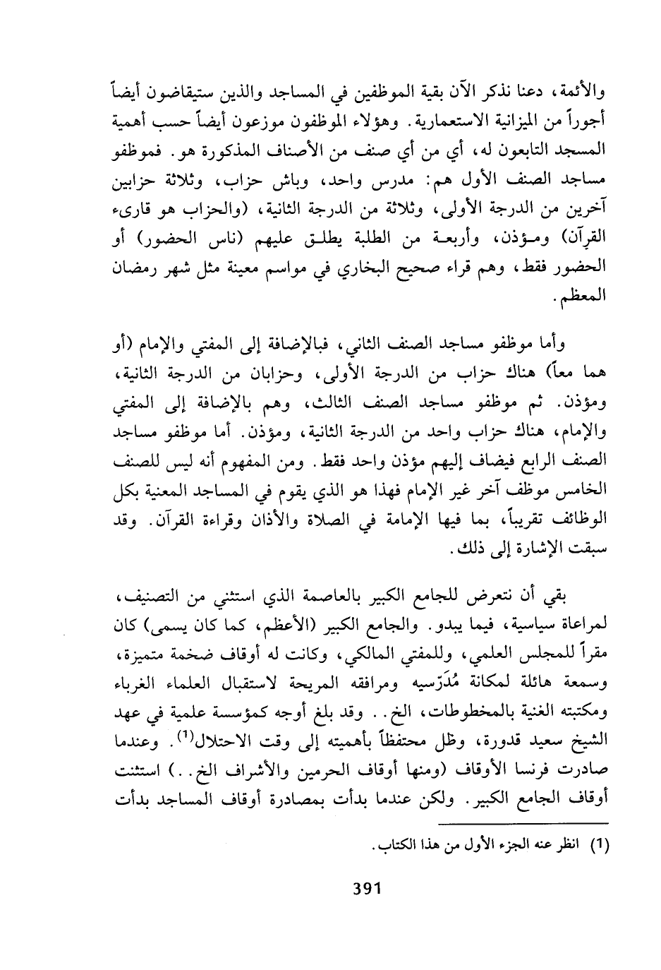 والأئمة، دعنا نذكر الآن بقية الموظفين في المساجد والذين ستيقاضون أيضا أجورا من الميزانية الاستعمارية، وهؤلاء الموظفون موزعون أيضا حسب أهمية المسجد التابعون له، أي من أي صنف من الأصناف المذكورة هو، فموظفو مساجد الصنف الأول هم: مدرس واحد، وباش حزاب، وثلاثة حزابين آخرين من الدرجة الأولى، وثلاثة من الدرجة الثانية، (والحزاب هو قارئ القرآن) ومؤذن، وأربعة من الطلبة يطلق عليهم (ناس الحضور) أو الحضور فقط، وهم قراء صحيح البخاري في مواسم معينة مثل شهر رمضان المعظم.