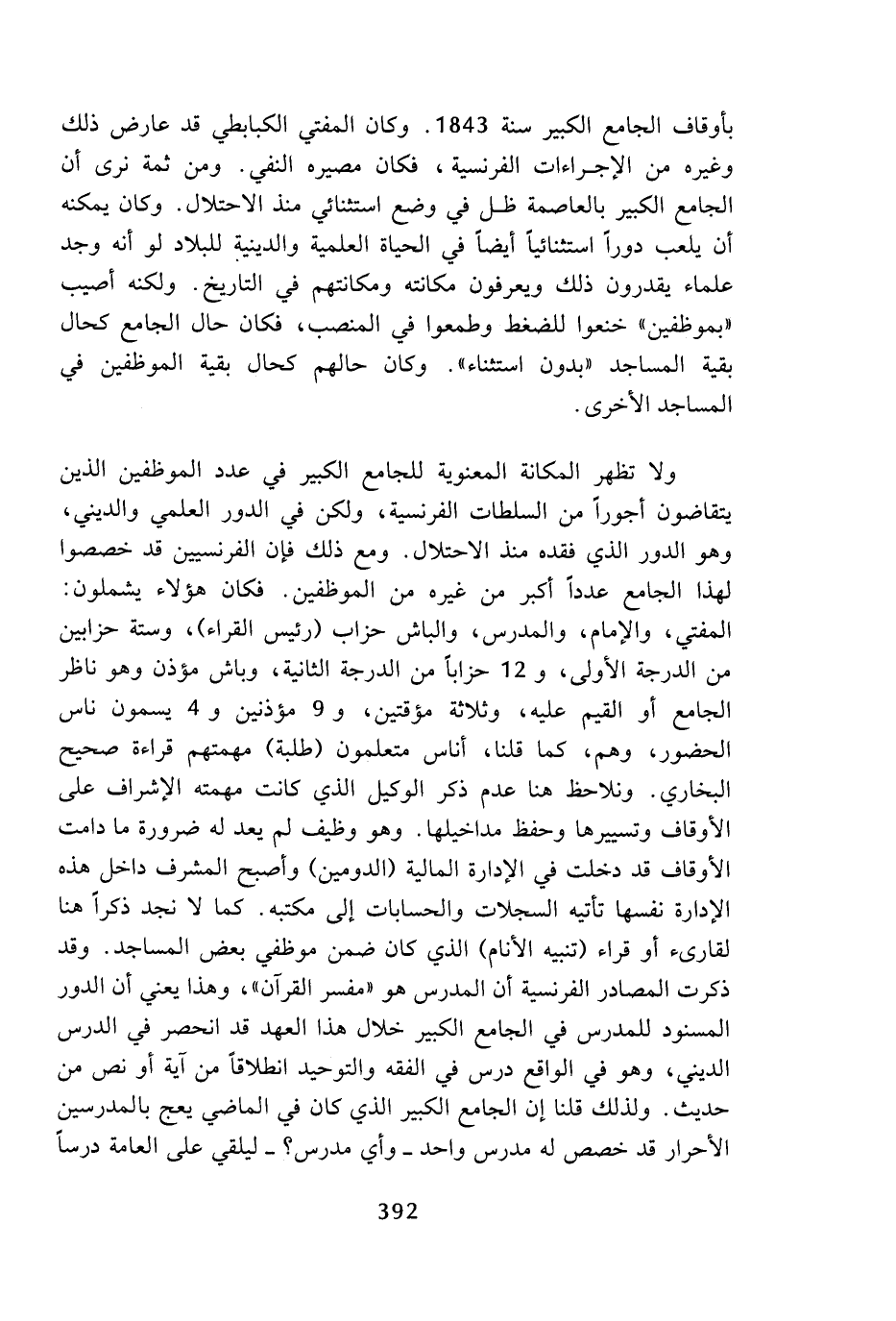 بأوقاف الجامع الكبير سنة 1843، وكان المفتي الكبابطي قد عارض ذلك وغيره من الإجراءات الفرنسية، فكان مصيره النفي، ومن ثمة نرى أن الجامع الكبير بالعاصمة ظل في وضع استثنائي منذ الاحتلال، وكان يمكنه أن يلعب دورا استثنائيا أيضا في الحياة العلمية والدينية للبلاد لو أنه وجد علماء يقدرون ذلك ويعرفون مكانته ومكانتهم في التاريخ، ولكنه أصيب (بموظفين) خنعوا للضغط وطمعوا في المنصب، فكان حال الجامع كحال بقية المساجد (بدون استثناء)، وكان حالهم كحال بقية الموظفين في المساجد الأخرى.