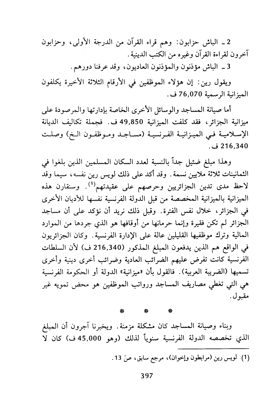 أما صيانة المساجد والوسائل الأخرى الخاصة بإدارتها والمرصودة على ميزانية الجزائر، فقد كلفت الميزانية 49، 850 ف، فجملة تكاليف الديانة الإسلامية في الميزانية الفرنسية (مساجد وموظفون الخ) وصلت 216، 340 ف.