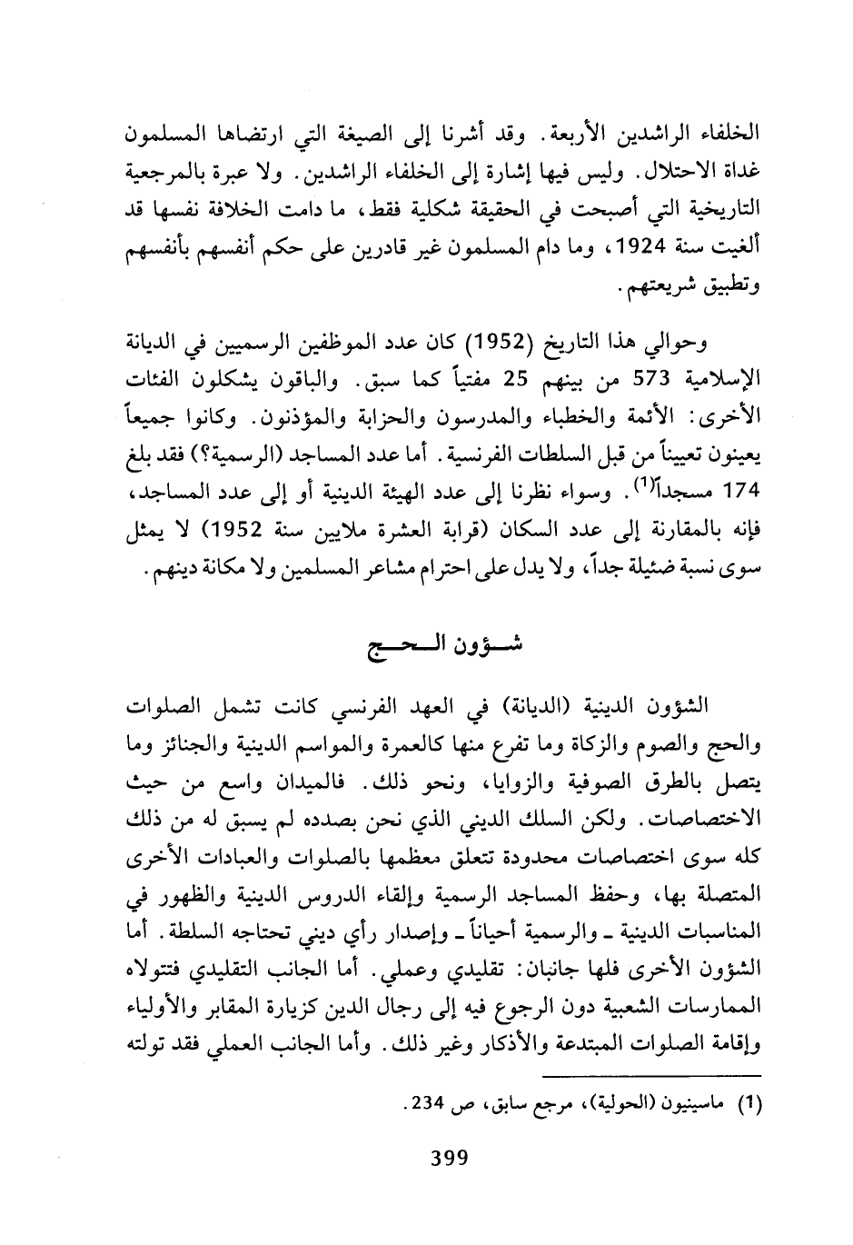 الخلفاء الراشدين الأربعة، وقد أشرنا إلى الصيغة التي ارتضاها المسلمون غداة الاحتلال، وليس فيها إشارة إلى الخلفاء الراشدين، ولا عبرة بالمرجعية التاريخية التي أصبحت في الحقيقة شكلية فقط، ما دامت الخلافة نفسها قد ألغيت سنة 1924، وما دام المسلمون غير قادرين على حكم أنفسهم بأنفسهم وتطبيق شريعتهم.