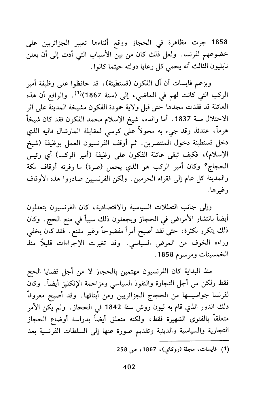 ويزعم فايسات أن آل الفكون (قسنطينة). قد حافظوا على وظيفة أمير الركب التي كانت لهم في الماضي، إلى (سنة 1867) (¬1). والواقع أن هذه العائلة قد فقدت مجدها حتى قبل ولاية حمودة الفكون مشيخة المدينة على أثر الاحتلال سنة 1837، أما والده، شيخ الإسلام محمد الفكون فقد كان شيخا هرما، عندئذ وقد جيء به محولا على كرسي لمقابلة المارشال فاليه الذي دخل قسنطينة دخول المنتصرين، ثم أوقف الفرنسيون العمل بوظيفة (شيخ الإسلام). فكيف تبقى عائلة الفكون على وظيفة (أمير الركب) أي رئيس الحجاج؟ وكان أمير الركب هو الذي يحمل (صرة) ما وفرته أوقاف مكة والمدينة كل عام إلى فقراء الحرمين، ولكن الفرنسيين صادروا هذه الأوقاف وغير ها.