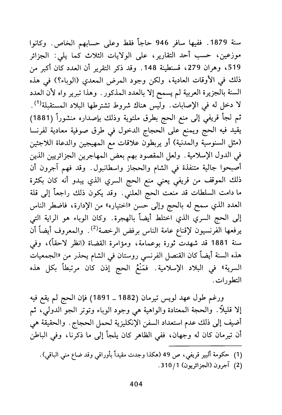 سنة 1879، ففيها سافر 946 حاجا فقط وعلى حسابهم الخاص، وكانوا موزعين، حسب أحد التقارير، على الولايات الثلاث كما يلي: الجزائر 519، وهران 279، قسنطينة 148، وقد ذكر التقرير أن العدد كان أكبر من ذلك في الأوقات العادية، ولكن وجود المرض المعدي (الوباء؟) في هذه السنة بالجزيرة العربية لم يسمح إلا بالعدد المذكور، وهذا تبرير واه لأن العدد لا دخل له في الإصابات، وليس هناك شروط تشترطها البلاد المستقبلة (¬1). ثم لجأ قريفي إلى منع الحج بطرق ملتوية وذلك بإصداره منشورا (1881) يقيد فيه الحج ويمنع على الحجاج الدخول في طرق صوفية معادية لفرنسا (مثل السنوسية والمدنية) أو يربطون علاقات مع المهيجين والدعاة اللاجئين في الدول الإسلامية، ولعل المقصود بهم بعض المهاجرين الجزائريين الذين أصبحوا جالية متنفذة في الشام والحجاز واسطانبول، وقد فهم آجرون أن ذلك الموقف من قريفي يعني منع الحج السري الذي يبدو أنه كان بكثرة ما دامت السلطات قد منعت الحج العلني، وقد يكون ذلك راجعا إلى قلة العدد الذي سمح له بالحج وإلى حسن (اختياره) من الإدارة، فاضطر الناس إلى الحج السري الذي اختلط أيضا بالهجرة، وكان الوباء هو الراية التي يرفعها الفرنسيون لإقناع عامة الناس برفض الرخصة (¬2). والمعروف أيضا أن سنة 1881 قد شهدت ثورة بوعمامة، ومؤامرة القضاة (انظر لاحقا). وفي هذه السنة أيضا كان القنصل الفرنسي روستان في الشام يحذر من (الجمعيات السرية) في البلاد الإسلامية، فمنع الحج إذن كان مرتبطا بكل هذه التطورات.