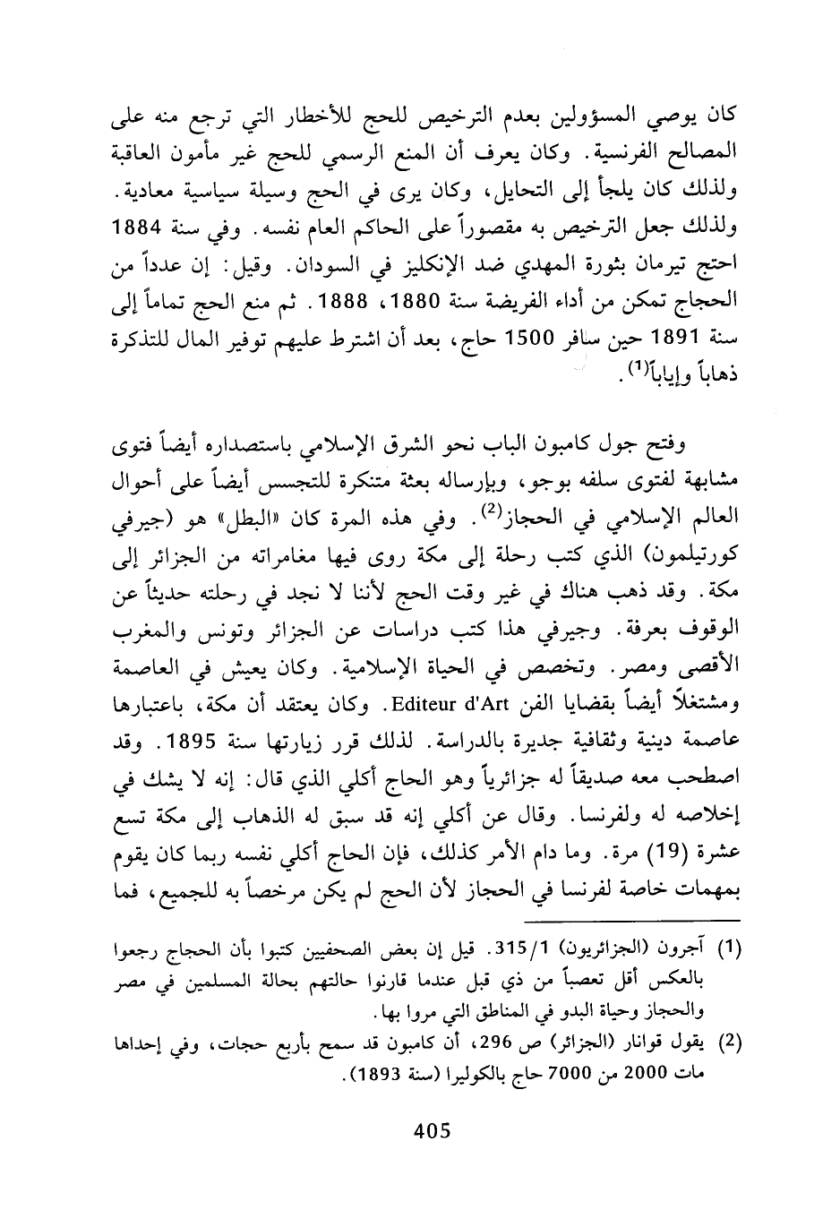 (¬2) يقول قوانار (الجزائر) ص 296، أن كامبون قد سمح بأربع حجات، وفي إحداها مات 2000 من 7000 حاج بالكوليرا (سنة 1893).