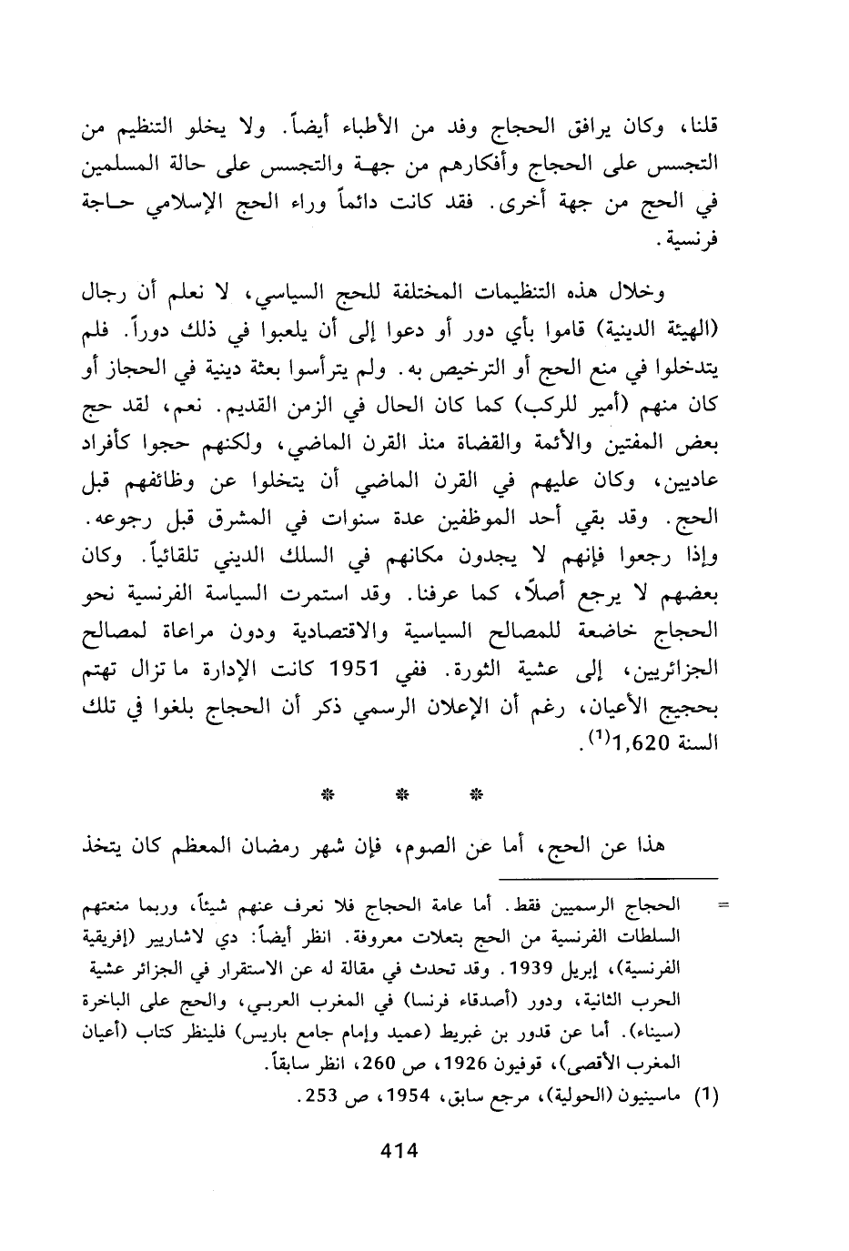 = الحجاج الرسميين فقط، أما عامة الحجاج فلا نعرف عنهم شيئا، وربما منعتهم السلطات الفرنسية من الحج بتعلات معروفة، انظر أيضا: دي لاشاريير (إفريقية الفرنسية). إبريل 1939، وقد تحدث في مقالة له عن الاستقرار في الجزائر عشية الحرب الثانية، ودور (أصدقاء فرنسا) في المغرب العربي، والحج على الباخرة (سيناء). أما عن قدور بن غبريط (عميد وإمام جامع باريس) فلينظر كتاب (أعيان المغرب الأقصى). قوفيون 1926، ص 260، انظر سابقا.