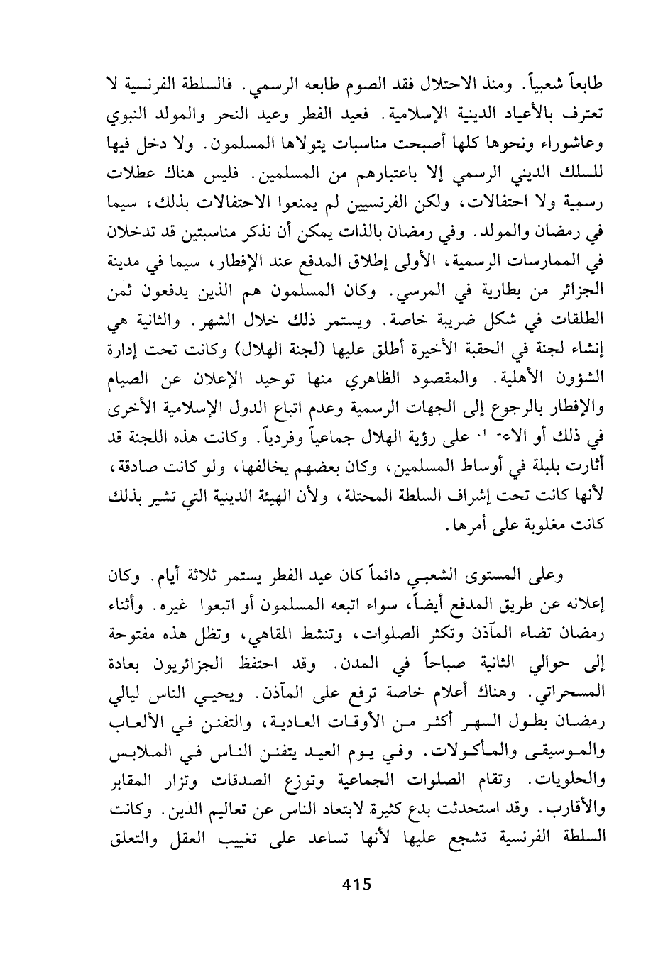 طابعا شعبيا، ومنذ الاحتلال فقد الصوم طابعه الرسمي، فالسلطة الفرنسية لا تعترف بالأعياد الدينية الإسلامية، فعيد الفطر وعيد النحر والمولد النبوي وعاشوراء ونحوها كلها أصبحت مناسبات يتولاها المسلمون، ولا دخل فيها للسلك الديني الرسمي إلا باعتبارهم من المسلمين، فليس هناك عطلات رسمية ولا احتفالات، ولكن الفرنسيين لم يمنعوا الاحتفالات بذلك، سيما في رمضان والمولد، وفي رمضان بالذات يمكن أن نذكر مناسبتين قد تدخلان في الممارسات الرسمية، الأولى إطلاق المدفع عند الإفطار، سيما في مدينة الجزائر من بطارية في المرسي، وكان المسلمون هم الذين يدفعون ثمن الطلقات في شكل ضريبة خاصة، ويستمر ذلك خلال الشهر، والثانية هي إنشاء لجنة في الحقبة الأخيرة أطلق عليها (لجنة الهلال) وكانت تحت إدارة الشؤون الأهلية، والمقصود الظاهري منها توحيد الإعلان عن الصيام والإفطار بالرجوع إلى الجهات الرسمية وعدم اتباع الدول الإسلامية الأخرى في ذلك أو الاعتماد على رؤية الهلال جماعيا وفرديا، وكانت هذه اللجنة قد أثارت بلبلة في أوساط المسلمين، وكان بعضهم يخالفها، ولو كانت صادقة، لأنها كانت تحت إشراف السلطة المحتلة، ولأن الهيئة الدينية التي تشير بذلك كانت مغلوبة على أمرها.