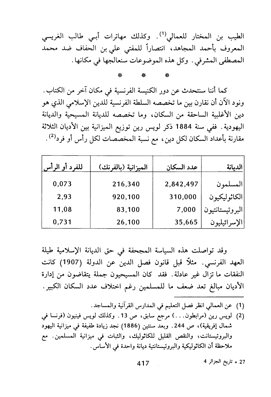 كما أننا سنتحدث عن دور الكنيسة الفرنسية في مكان آخر من الكتاب. ونود الآن أن نقارن بين ما تخصصه السلطة الفرنسية للدين الإسلامي الذي هو دين الأغلبية الساحقة من السكان، وما تخصصه للديانة المسيحية والديانة اليهودية، ففي سنة 1884 ذكر لويس رين توزيع الميزانية بين الأديان الثلاثة مقارنة بأعداد السكان لكل دين، مع نسبة المخصصات لكل رأس أو فرد (¬2).