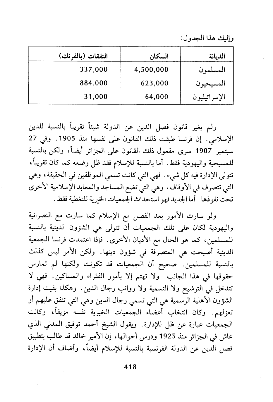 ولم يغير قانون فصل الدين عن الدولة شيئا تقريبا بالنسبة للدين الإسلامي، إن فرنسا طبقت ذلك القانون على نفسها منذ 1905، وفي 27 سبتمبر 1907 سرى مفعول ذلك القانون على الجزائر أيضا، ولكن بالنسبة للمسيحية واليهودية فقط، أما بالنسبة للإسلام فقد ظل وضعه كما كان تقريبا، تتولى الإدارة فيه كل شيء، فهي التي كانت تسمي الموظفين في الحقيقة، وهي التي تتصرف في الأوقاف، وهي التي تضع المساجد والمعابد الإسلامية الأخرى تحت نفوذها، أما الجديد فهو استحداث الجمعيات الخيرية للتغطية فقط.