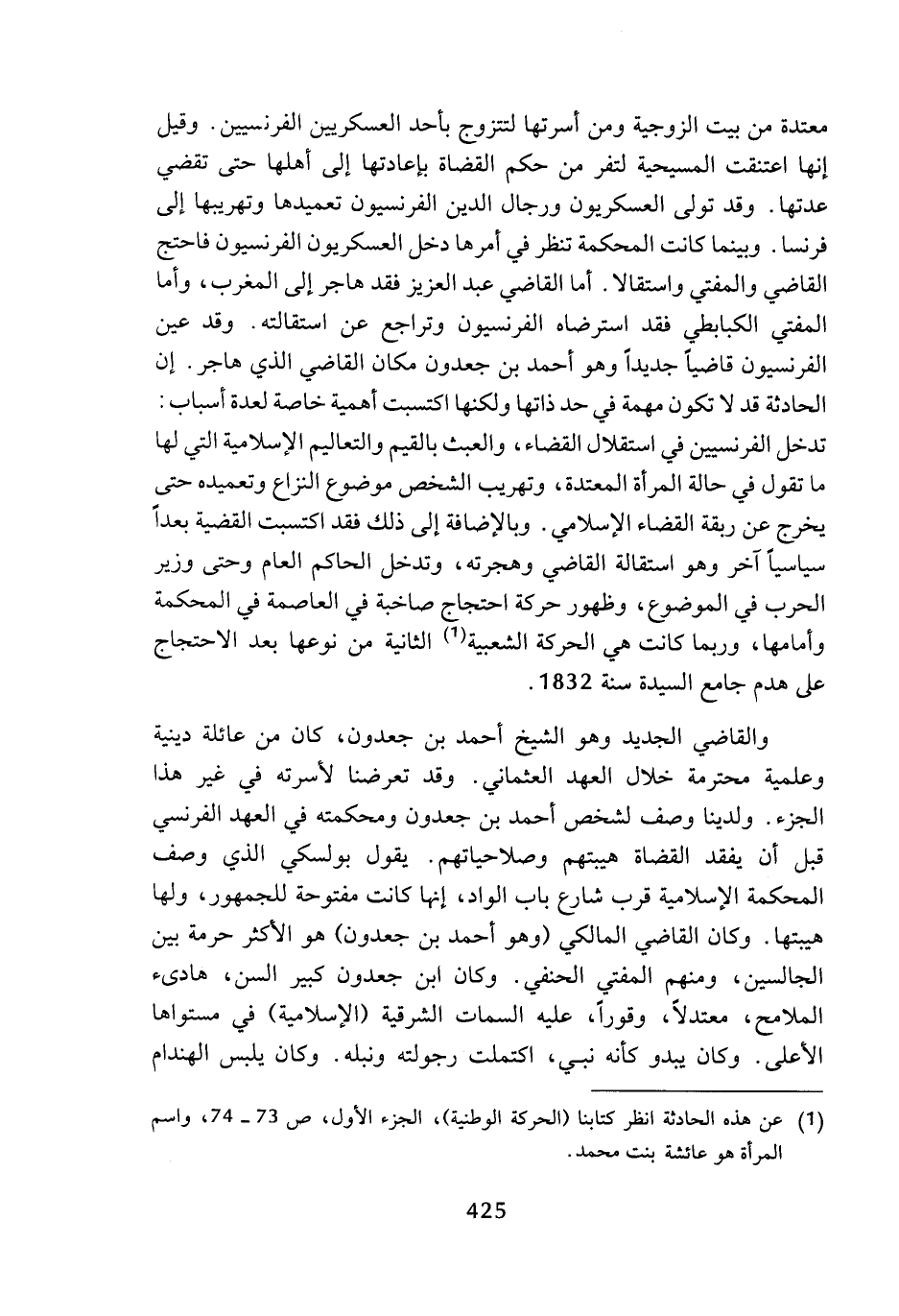 معتدة من بيت الزوجية ومن أسرتها لتتزوج بأحد العسكريين الفرنحسيين، وقيل إنها اعتنقت المسيحية لتفر من حكم القضاة بإعادتها إلى أهلها حتى تقضي عدتها، وقد تولى العسكريون ورجال الدين الفرنسيون تعميدها وتهريبها إلى فرنسا، وبينما كانت المحكمة تنظر في أمرها دخل العسكريون الفرنسيون فاحتج القاضي والمفتي واستقالا، أما القاضي عبد العزيز فقد هاجر إلى المغرب، وأما المفتي الكبابطي فقد استرضاه الفرنسيون وتراجع عن استقالته، وقد عين الفرنسيون قاضيا جديدا وهو أحمد بن جعدون مكان القاضي الذي هاجر، إن الحادثة قد لا تكون مهمة في حد ذاتها ولكنها اكتسبت أهمية خاصة لعدة أسباب: تدخل الفرنسيين في استقلال القضاء، والعبث بالقيم والتعاليم الإسلامية التي لها ما تقول في حالة المرأة المعتدة، وتهريب الشخص موضوع النزل وتعميده حتى يخرج عن ربقة القضاء الإسلامي، وبالإضافة إلى ذلك فقد اكتسبت القضية بعدا سياسيا آخر وهو استقالة القاضي وهجرته، وتدخل الحاكم العام وحتى وزير الحرب في الموضوع، وظهور حركة احتجاج صاخبة في العاصمة في المحكمة وأمامها، وربما كانت هي الحركة الشعبية (¬1) الثانية من نوعها بعد الاحتجاج على هدم جامع السيدة سنة 1832.