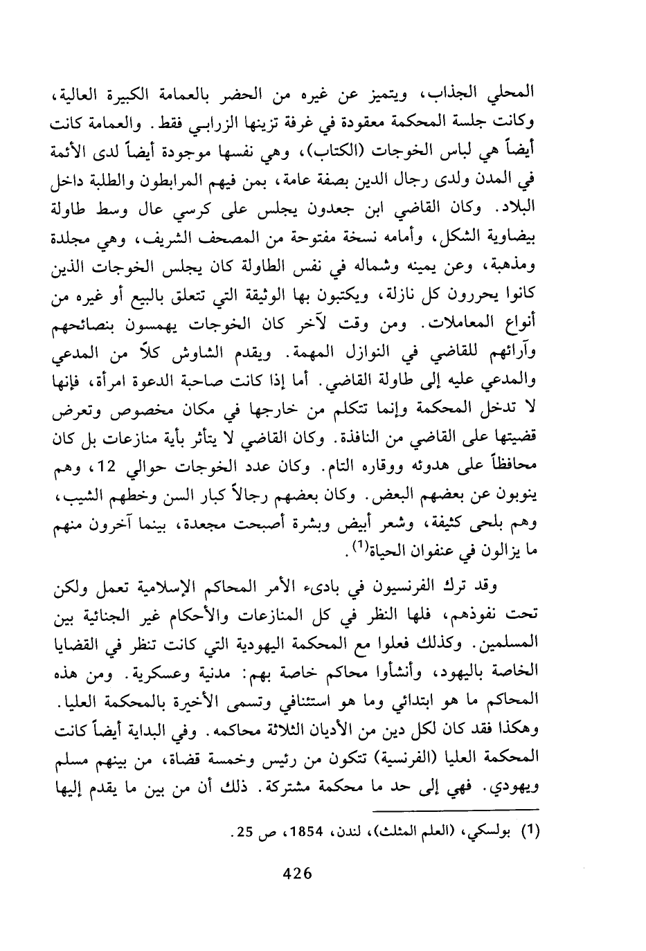 وقد ترك الفرنسيون في بادئ الأمر المحاكم الإسلامية تعمل ولكن تحت نفوذهم، فلها النظر في كل المنازعات والأحكام غير الجنائية بين المسلمين، وكذلك فعلوا مع المحكمة اليهودية التي كانت تنظر في القضايا الخاصة باليهود، وأنشأوا محاكم خاصة بهم: مدنية وعسكرية، ومن هذه المحاكم ما هو ابتدائي وما هو استئنافي وتسمى الأخيرة بالمحكمة العليا، وهكذا فقد كان لكل دين من الأديان الثلاثة محاكمه، وفي البداية أيضا كانت المحكمة العليا (الفرنسية) تتكون من رئيس وخمسة قضاة، من بينهم مسلم ويهودي، فهي إلى حد ما محكمة مشتركة، ذلك أن من بين ما يقدم إليها