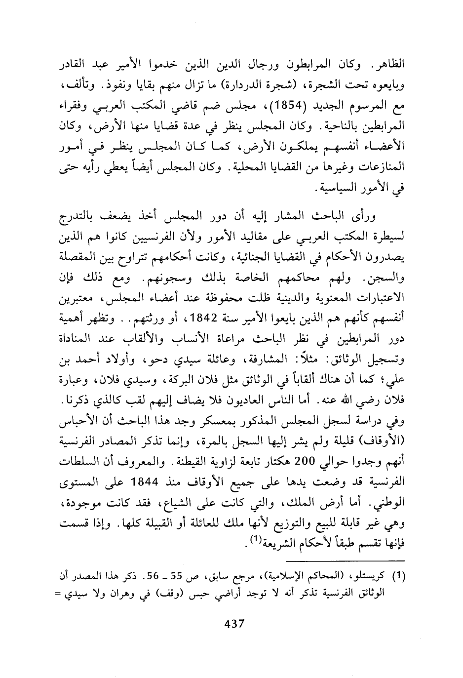 (¬1) كريستلو، (المحاكم الإسلامية)، مرجع سابق، ص 55 - 56، ذكر هذا المصدر أن الوثائق الفرنسية تذكر أنه لا توجد أراضي حبس (وقف) في وهران ولا سيدي =