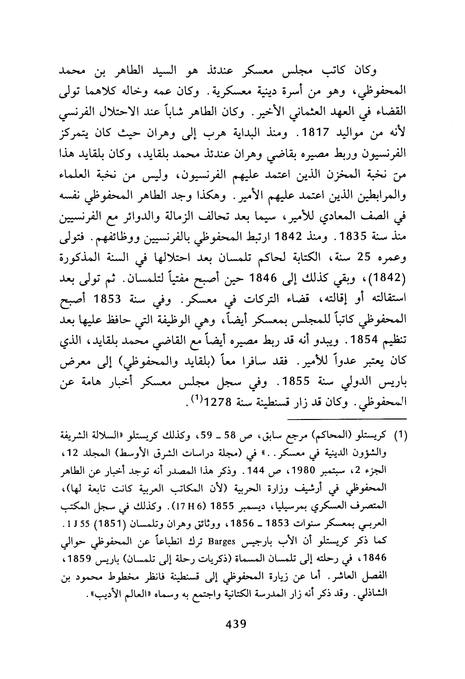 (¬1) كريستلو (المحاكم) مرجع سابق، ص 58 - 59، وكذلك كريستلو (السلالة الشريفة والشؤون الدينية في معسكر ..) في (مجلة دراسات الشرق الأوسط) المجلد 12، الجزء 2، سبتمبر 1980، ص 144، وذكر هذا المصدر أنه توجد أخبار عن الطاهر المحفوظي في أرشيف وزارة الحربية (لأن المكاتب العربية كانت تابعة لها)، المتصرف العسكري بمرسيليا، ديسمبر 1855 (6 H 17). وكذلك في سجل المكتب العربي بمعسكر سنوات 1853 - 1856، ووثائق وهران وتلمسان (1851) 55 J 1. كما ذكر كريستلو أن الأب بارجيس Barges ترك انطباعا عن المحفوظي حوالي 1846، في رحلته إلى تلمسان المسماة (ذكريات رحلة إلى تلمسان) باريس 1859، الفصل العاشر، أما عن زيارة المحفوظي إلى قسنطينة فانظر مخطوط محمود بن الشاذلي، وقد ذكر أنه زار المدرسة الكتانية واجتمع به وسماه (العالم الأديب).
