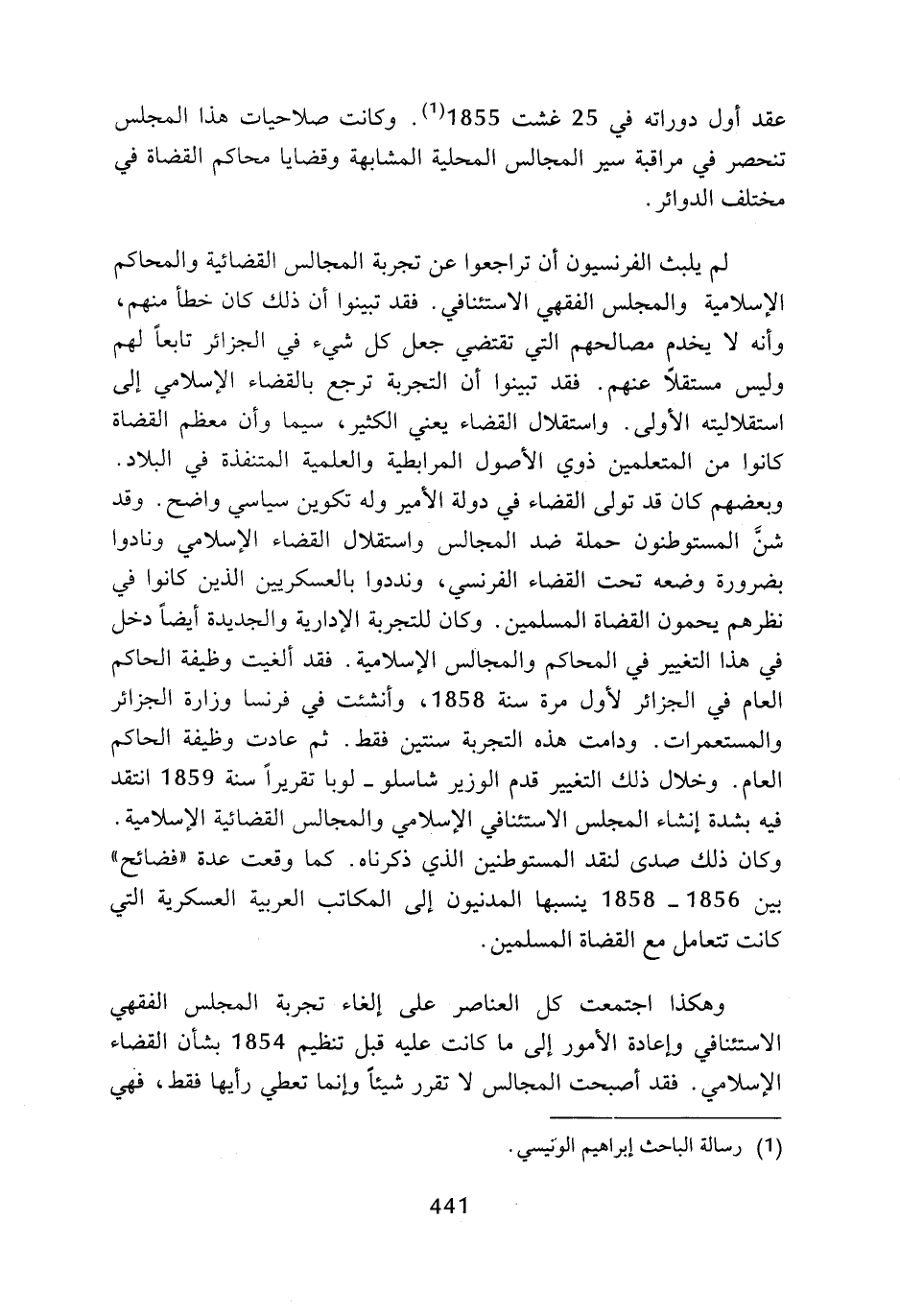 وهكذا اجتمعت كل العناصر على إلغاء تجربة المجلس الفقهي الاستئنافي وإعادة الأمور إلى ما كانت عليه قبل تنظيم 1854 بشأن القضاء الإسلامي، فقد أصبحت المجالس لا تقرر شيئا وإنما تعطي رأيها فقط، فهي