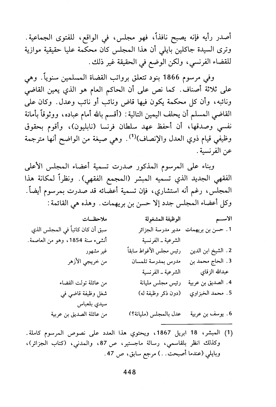 1 - حسن بن بريهمات ... مدير مدرسة الجزائر الشرعية - الفرنسية ... سبق أن كان كاتبا في المجلس الذي أنشئ سنة 1854، وهومن العاصمة.