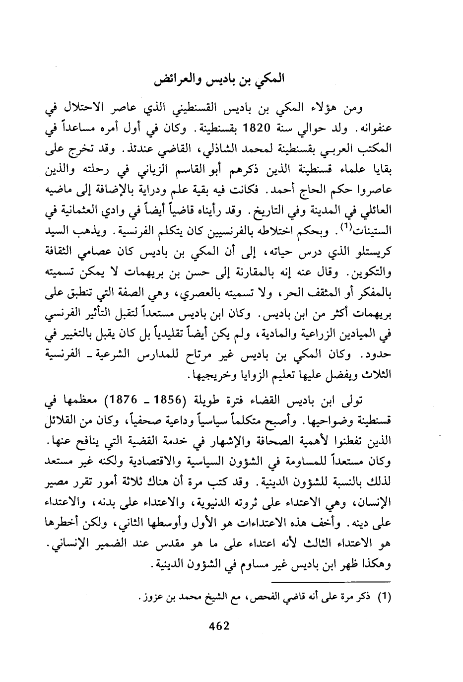 ومن هؤلاء المكي بن باديس القسنطيني الذي عاصر الاحتلال في عنفوانه، ولد حوالي سنة 1820 بقسنطينة، وكان في أول أمره مساعدا في المكتب العربي بقسنطينة لمحمد الشاذلي، القاضي عندئذ، وقد تخرج على بقايا علماء قسنطينة الذين ذكرهم أبو القاسم الزياني في رحلته والذين عاصروا حكم الحاج أحمد، فكانت فيه بقية علم ودراية بالإضافة إلى ماضيه العائلي في المدينة وفي التاريخ، وقد رأيناه قاضيا أيضا في وادي العثمانية في الستينات (¬1). وبحكم اختلاطه بالفرنسيين كان يتكلم الفرنسية، ويذهب السيد كريستلو الذي درس حياته، إلى أن المكي بن باديس كان عصامي الثقافة والتكوين، وقال عنه إنه بالمقارنة إلى حسن بن بريهمات لا يمكن تسميته بالمفكر أو المثقف الحر، ولا تسميته بالعصري، وهي الصفة التي تنطبق على بريهمات أكثر من ابن باديس، وكان ابن باديس مستعدا لتقبل التأثير الفرنسي في الميادين الزراعية والمادية، ولم يكن أيضا تقليديا بل كان يقبل بالتغيير في حدود، وكان المكي بن باديس غير مرتاح للمدارس الشرعية - الفرنسية الثلاث ويفضل عليها تعليم الزوايا وخريجيها.