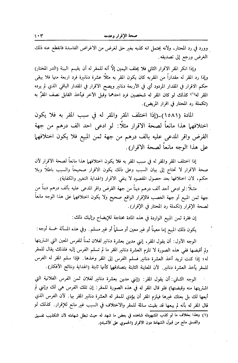 الْمَادَّةُ (1581) - (إذَا اخْتَلَفَ الْمُقِرُّ، وَالْمُقَرُّ لَهُ فِي سَبَبِ الْمُقَرِّ بِهِ فَلَا يَكُونُ اخْتِلَافُهُمَا هَذَا مَانِعًا لِصِحَّةِ الْإِقْرَارِ مَثَلًا: لَوْ ادَّعَى أَحَدٌ أَلْفَ دِرْهَمٍ مِنْ جِهَةِ الْقَرْضِ، وَأَقَرَّ الْمُدَّعَى عَلَيْهِ بِأَلْفِ دِرْهَمٍ مِنْ جِهَةِ ثَمَنِ الْمَبِيعِ فَلَا يَكُونُ اخْتِلَافُهُمَا عَلَى هَذَا الْوَجْهِ مَانِعًا لِصِحَّةِ الْإِقْرَارِ) .