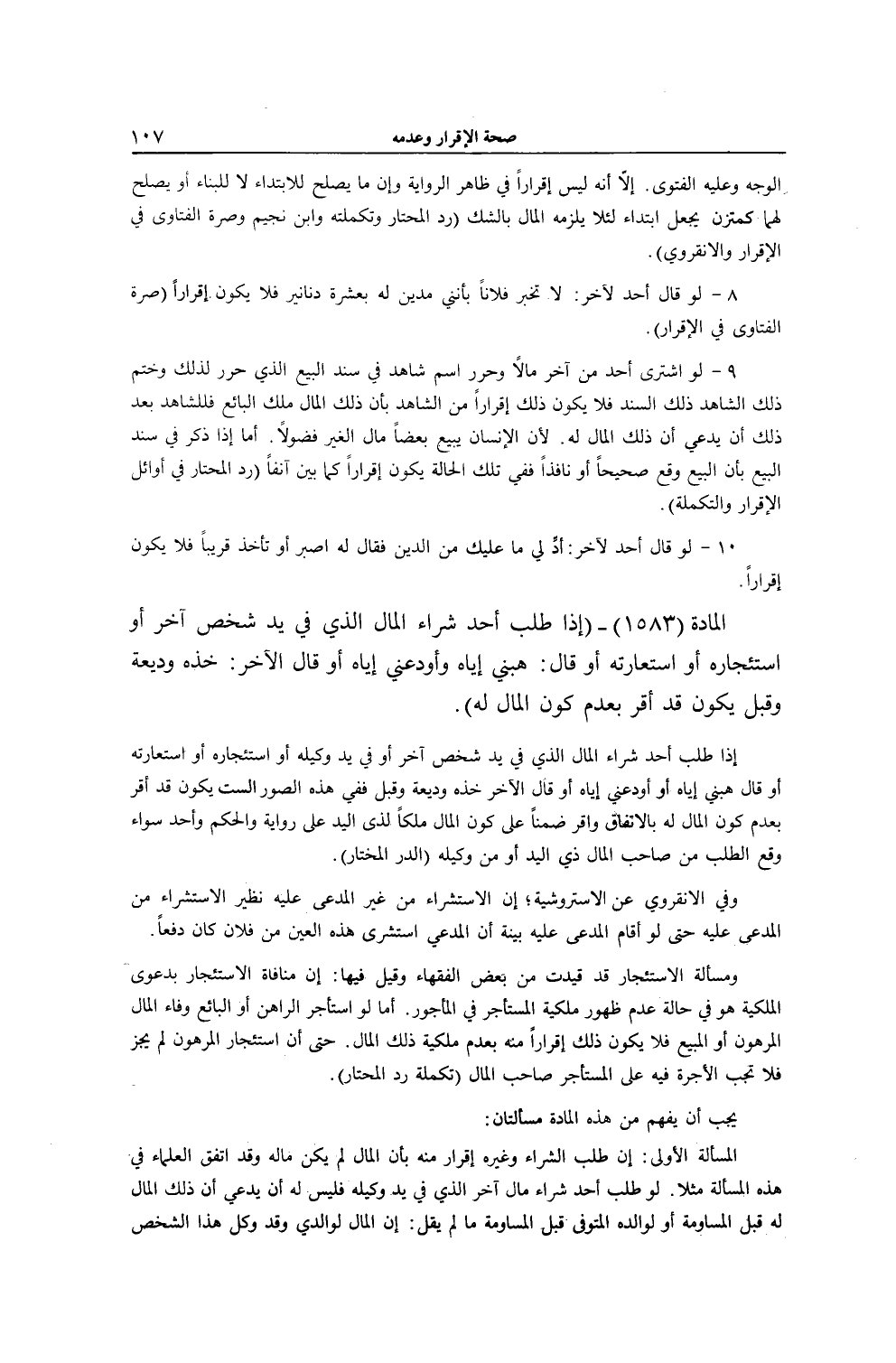 يَجِبُ أَنْ يُفْهَمَ مِنْ هَذِهِ الْمَادَّةِ مَسْأَلَتَانِ: الْمَسْأَلَةُ الْأُولَى: إنَّ طَلَبَ الشِّرَاءِ وَغَيْرِهِ إقْرَارٌ مِنْهُ بِأَنَّ الْمَالَ لَمْ يَكُنْ مَالَهُ، وَقَدْ اتَّفَقَ الْعُلَمَاءُ فِي هَذِهِ الْمَسْأَلَةِ مَثَلًا.
