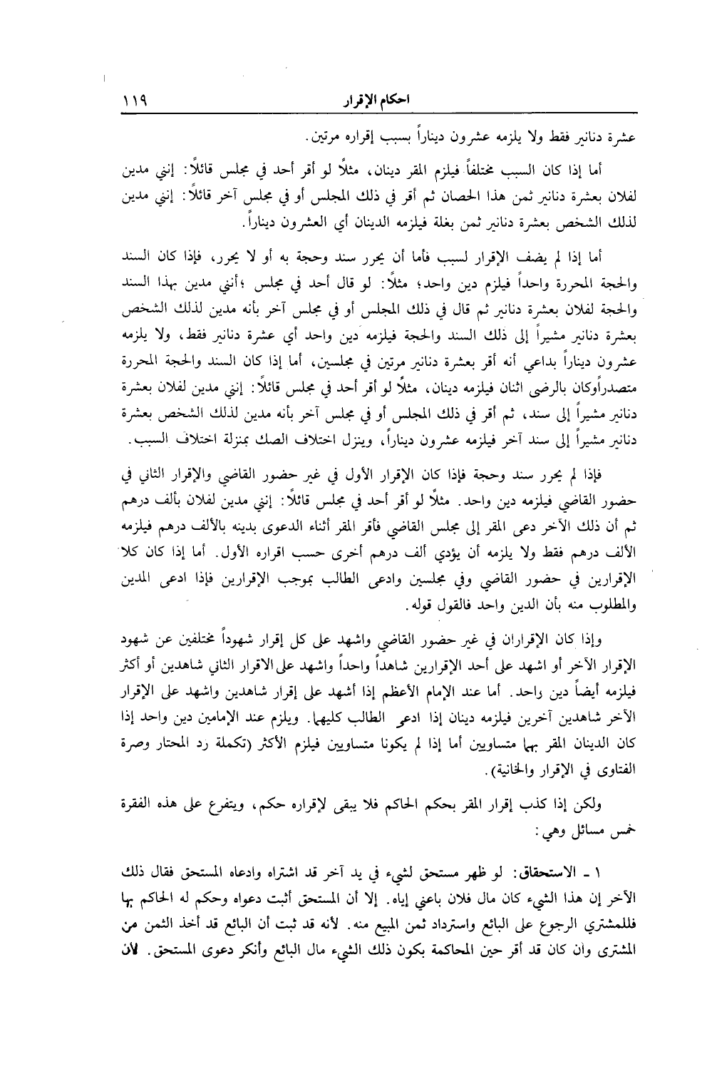 أَمَّا إذَا لَمْ يُضَفْ الْإِقْرَارُ لِسَبَبٍ فَإِمَّا أَنْ يُحَرَّرَ سَنَدٌ وَحُجَّةٌ بِهِ، أَوْ لَا يُحَرَّرَ، فَإِذَا كَانَ السَّنَدُ وَالْحُجَّةُ الْمُحَرَّرَةُ وَاحِدًا فَيَلْزَمُ دَيْنٌ وَاحِدٌ؛ مَثَلًا: لَوْ قَالَ أَحَدٌ فِي مَجْلِسٍ؛ إنَّنِي مَدِينٌ بِهَذَا السَّنَدِ وَالْحُجَّةِ لِفُلَانٍ بِعَشَرَةِ دَنَانِيرَ ثُمَّ قَالَ فِي ذَلِكَ الْمَجْلِسِ، أَوْ فِي مَجْلِسٍ آخَرَ بِأَنَّهُ مَدِينٌ لِذَلِكَ الشَّخْصِ بِعَشَرَةِ دَنَانِيرَ مُشِيرًا إلَى ذَلِكَ السَّنَدِ وَالْحُجَّةِ فَيَلْزَمُهُ دَيْنٌ وَاحِدٌ أَيْ عَشَرَةُ دَنَانِيرَ فَقَطْ، وَلَا يَلْزَمُهُ عِشْرُونَ دِينَارًا بِدَاعِي أَنَّهُ أَقَرَّ بِعَشَرَةِ دَنَانِيرَ مَرَّتَيْنِ فِي مَجْلِسَيْنِ، أَمَّا إذَا كَانَ السَّنَدُ وَالْحُجَّةُ الْمُحَرَّرَةُ مُتَعَدِّدًا، وَكَانَ بِالْفَرْضِ اثْنَانِ فَيَلْزَمُهُ دَيْنَانِ، مَثَلًا لَوْ أَقَرَّ أَحَدٌ فِي مَجْلِسٍ قَائِلًا: إنَّنِي مَدِينٌ لِفُلَانٍ بِعَشَرَةِ دَنَانِيرَ مُشِيرًا إلَى سَنَدٍ، ثُمَّ أَقَرَّ فِي ذَلِكَ الْمَجْلِسِ، أَوْ فِي مَجْلِسٍ آخَرَ بِأَنَّهُ مَدِينٌ لِذَلِكَ الشَّخْصِ بِعَشَرَةِ دَنَانِيرَ مُشِيرًا إلَى سَنَدٍ آخَرَ فَيَلْزَمُهُ عِشْرُونَ دِينَارًا، وَيُنَزَّلُ اخْتِلَافُ الصَّكِّ بِمَنْزِلَةِ اخْتِلَافِ السَّبَبِ.