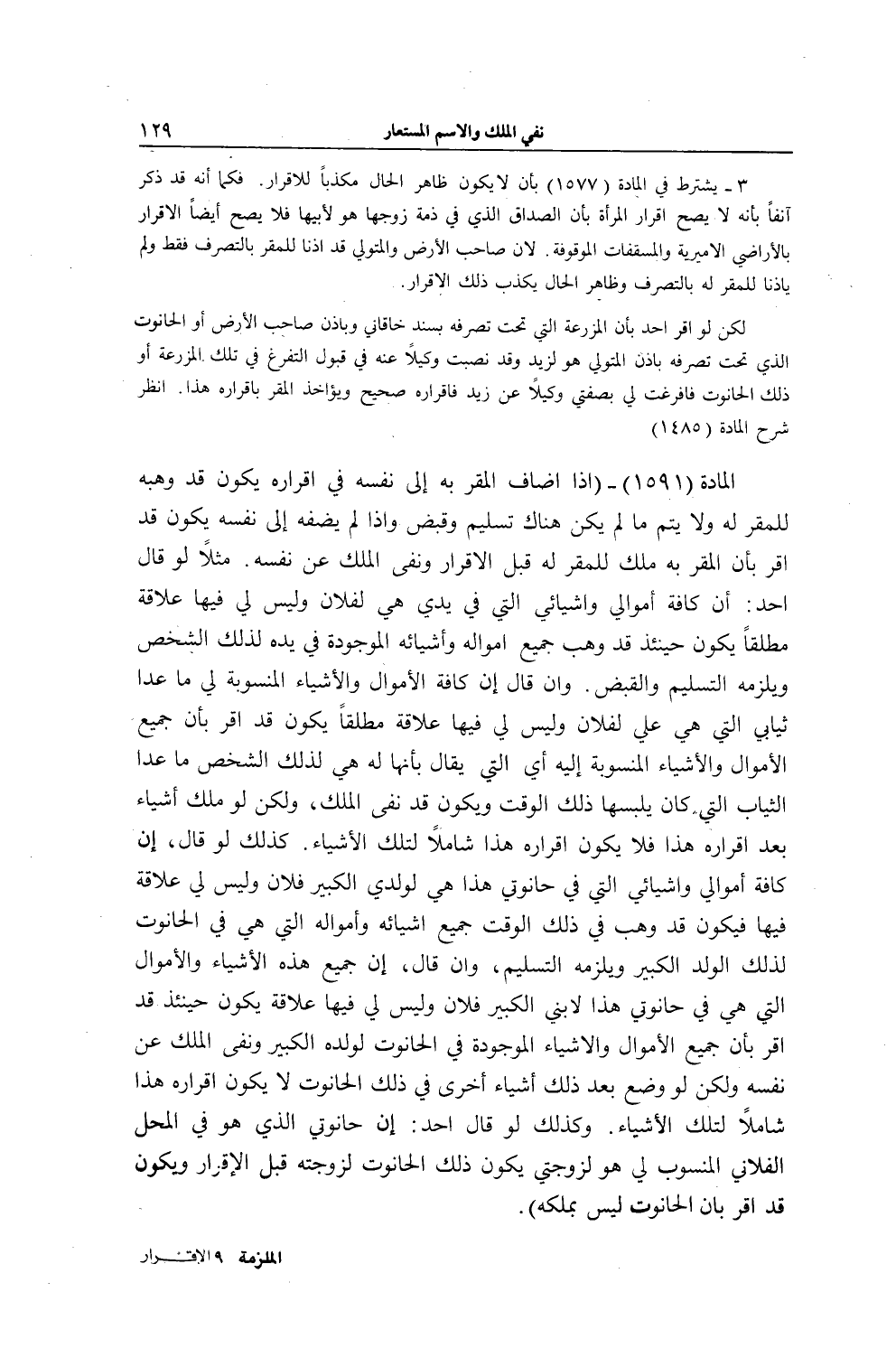 الْمَادَّةُ (1591) - (إذَا أَضَافَ الْمُقَرَّ بِهِ إلَى نَفْسِهِ فِي إقْرَارِهِ يَكُونُ قَدْ وَهَبَهُ لِلْمُقَرِّ لَهُ، وَلَا يَتِمُّ مَا لَمْ يَكُنْ هُنَاكَ تَسْلِيمٌ وَقَبْضٌ، وَإِذَا لَمْ يُضِفْهُ إلَى نَفْسِهِ يَكُونُ قَدْ أَقَرَّ بِأَنَّ الْمُقَرَّ بِهِ مِلْكٌ لِلْمُقَرِّ لَهُ قَبْلَ الْإِقْرَارِ وَنَفْيِ الْمِلْكِ عَنْ نَفْسِهِ. مَثَلًا لَوْ قَالَ أَحَدٌ: إنَّ كَافَّةَ أَمْوَالِي وَأَشْيَائِي الَّتِي فِي يَدِي هِيَ لِفُلَانٍ، وَلَيْسَ لِي فِيهَا عَلَاقَةٌ مُطْلَقًا يَكُونُ حِينَئِذٍ قَدْ وَهَبَ جَمِيعَ أَمْوَالِهِ وَأَشْيَائِهِ الْمَوْجُودَةِ فِي يَدِهِ لِذَلِكَ الشَّخْصِ، وَيَلْزَمُهُ التَّسْلِيمُ وَالْقَبْضُ. وَإِنْ قَالَ: إنَّ كَافَّةَ الْأَمْوَالِ وَالْأَشْيَاءِ الْمَنْسُوبَةِ لِي مَا عَدَا ثِيَابِي الَّتِي هِيَ عَلَيَّ لِفُلَانٍ، وَلَيْسَ لِي فِيهَا عَلَاقَةٌ مُطْلَقًا يَكُونُ قَدْ أَقَرَّ بِأَنَّ جَمِيعَ الْأَمْوَالِ وَالْأَشْيَاءِ الْمَنْسُوبَةِ إلَيْهِ أَيْ الَّتِي يُقَالُ بِأَنَّهَا لَهُ هِيَ لِذَلِكَ الشَّخْصِ مَا عَدَا الثِّيَابَ الَّتِي كَانَ يَلْبَسُهَا ذَلِكَ الْوَقْتَ، وَيَكُونُ قَدْ نَفَى الْمِلْكَ، وَلَكِنْ لَوْ مَلَكَ أَشْيَاءَ بَعْدَ إقْرَارِهِ هَذَا، فَلَا يَكُونُ إقْرَارُهُ هَذَا شَامِلًا لِتِلْكَ الْأَشْيَاءِ. كَذَلِكَ لَوْ قَالَ: إنَّ كَافَّةَ أَمْوَالِي وَأَشْيَائِي الَّتِي فِي حَانُوتِي هَذَا هِيَ لِوَلَدِي الْكَبِيرِ فُلَانٍ، وَلَيْسَ لِي عَلَاقَةٌ فِيهَا فَيَكُونُ قَدْ وَهَبَ فِي ذَلِكَ الْوَقْتِ جَمِيعَ أَشْيَائِهِ وَأَمْوَالِهِ الَّتِي هِيَ فِي الْحَانُوتِ لِذَلِكَ الْوَلَدِ الْكَبِيرِ، وَيَلْزَمُهُ التَّسْلِيمُ، وَإِنْ قَالَ: إنَّ جَمِيعَ هَذِهِ الْأَشْيَاءِ وَالْأَمْوَالِ الَّتِي هِيَ فِي حَانُوتِي هَذَا لِابْنِي الْكَبِيرِ فُلَانٍ، وَلَيْسَ لِي فِيهَا عَلَاقَةٌ يَكُونُ حِينَئِذٍ قَدْ أَقَرَّ بِأَنَّ جَمِيعَ الْأَمْوَالِ وَالْأَشْيَاءِ الْمَوْجُودَةِ فِي الْحَانُوتِ لِوَلَدِهِ الْكَبِيرِ وَنَفَى الْمِلْكَ عَنْ نَفْسِهِ وَلَكِنْ لَوْ وَضَعَ بَعْدَ ذَلِكَ أَشْيَاءَ أُخْرَى فِي ذَلِكَ الْحَانُوتِ لَا يَكُونُ إقْرَارُهُ هَذَا شَامِلًا لِتِلْكَ الْأَشْيَاءِ. وَكَذَلِكَ لَوْ قَالَ أَحَدٌ: إنَّ حَانُوتِي الَّذِي هُوَ فِي الْمَحَلِّ الْفُلَانِيِّ الْمَنْسُوبِ لِي هُوَ لِزَوْجَتِي يَكُونُ ذَلِكَ الْحَانُوتُ لِزَوْجَتِهِ قَبْلَ الْإِقْرَارِ، وَيَكُونُ قَدْ أَقَرَّ بِأَنَّ الْحَانُوتَ لَيْسَ بِمِلْكِهِ) .