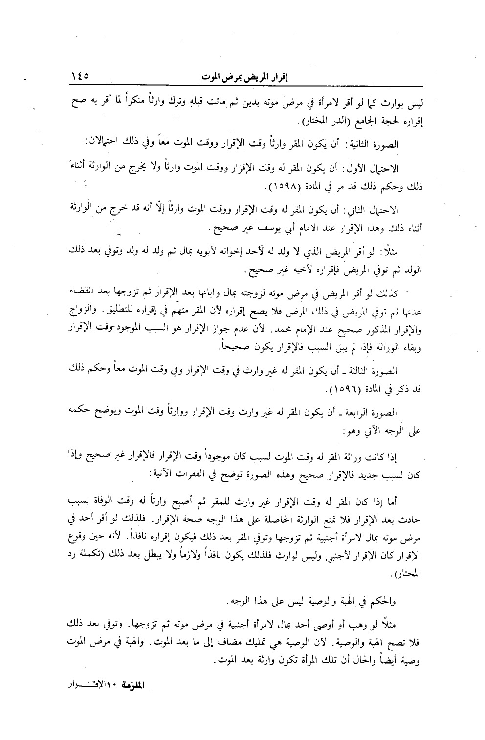 الصُّورَةُ الثَّانِيَةُ: أَنْ يَكُونَ الْمُقِرُّ وَارِثًا وَقْتَ الْإِقْرَارِ وَوَقْتَ الْمَوْتِ مَعًا، وَفِي ذَلِكَ احْتِمَالَانِ: الِاحْتِمَالُ الْأَوَّلُ: أَنْ يَكُونَ الْمُقَرُّ لَهُ وَقْتَ الْإِقْرَارِ وَوَقْتَ الْمَوْتِ وَارِثًا، وَلَا يَخْرُجُ مِنْ الْوَارِثَةِ أَثْنَاءَ ذَلِكَ، وَحُكْمُ ذَلِكَ قَدْ مَرَّ فِي الْمَادَّةِ (1598) .