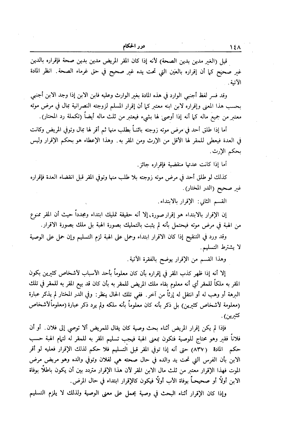 أَوْ إنَّ فُلَانًا فَقِيرٌ، وَهُوَ مُحْتَاجٌ لِلْوَصِيَّةِ فَتَكُونُ بِمَعْنَى الْهِبَةِ فَيَجِبُ تَسْلِيمُ الْمُقَرِّ بِهِ لِلْمُقَرِّ لَهُ لِتَمَامِ الْهِبَةِ حَسَبَ حُكْمِ الْمَادَّةِ (837) حَتَّى إنَّهُ إذَا تُوُفِّيَ الْمُقِرُّ قَبْلَ التَّسْلِيمِ فَلَا حُكْمَ لِذَلِكَ الْإِقْرَارِ فَعَلَيْهِ لَوْ أَقَرَّ الِابْنُ بِأَنَّ الْفَرَسَ الَّتِي تَحْتَ يَدِ وَالِدِهِ فِي حَالٍ صِحَّتِهِ هِيَ لِفُلَانٍ وَتُوُفِّيَ وَالِدُهُ، وَهُوَ مَرِيضٌ مَرَضَ الْمَوْتِ فَهَذَا الْإِقْرَارُ مُعْتَبَرٌ مِنْ ثُلُثِ مَالِ الِابْنِ الْمُقِرِّ؛ لِأَنَّ هَذَا الْإِقْرَارَ مُتَرَدِّدٌ بَيْنَ أَنْ يَكُونَ بَاطِلًا بِوَفَاةِ الِابْنِ أَوْ لَا، أَوْ صَحِيحًا بِوَفَاةِ الْأَبِ أَوْ لَا فَيَكُونُ كَالْإِقْرَارِ ابْتِدَاءً فِي حَالِ الْمَرَضِ.