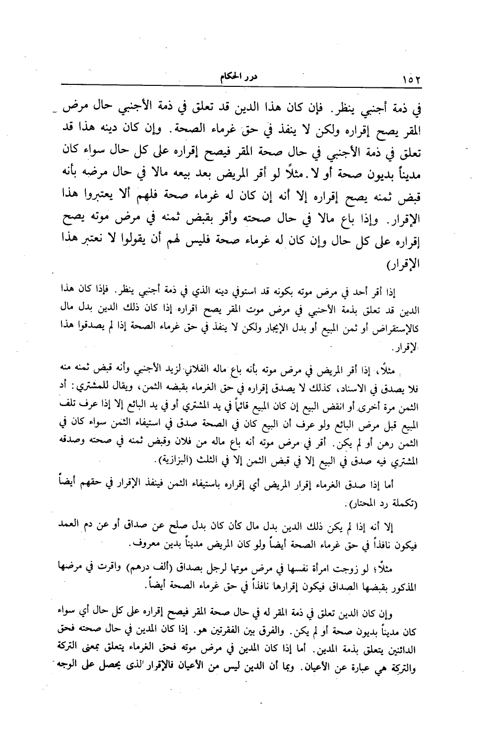فِي ذِمَّةِ أَجْنَبِيٍّ يُنْظَرُ. فَإِنْ كَانَ هَذَا الدَّيْنُ قَدْ تَعَلَّقَ فِي ذِمَّةِ الْأَجْنَبِيِّ حَالَ مَرَضِ الْمُقِرِّ يَصِحُّ إقْرَارُهُ، وَلَكِنْ لَا يُنَفَّذُ فِي حَقِّ غُرَمَاءِ الصِّحَّةِ. وَإِنْ كَانَ دَيْنُهُ هَذَا قَدْ تَعَلَّقَ فِي ذِمَّةِ الْأَجْنَبِيِّ فِي حَالِ صِحَّةِ الْمُقِرِّ فَيَصِحُّ إقْرَارُهُ عَلَى كُلِّ حَالٍ سَوَاءٌ كَانَ مَدِينًا بِدُيُونِ صِحَّةٍ أَوْ لَا مَثَلًا لَوْ أَقَرَّ الْمَرِيضُ بَعْدَ بَيْعِهِ مَالًا فِي حَالِ مَرَضِهِ بِأَنَّهُ قَبَضَ ثَمَنَهُ يَصِحُّ إقْرَارُهُ إلَّا أَنَّهُ إنْ كَانَ لَهُ غُرَمَاءُ صِحَّةٍ فَلَهُمْ أَلَّا يَعْتَبِرُوا هَذَا الْإِقْرَارَ. وَإِذَا بَاعَ مَالًا فِي حَالِ صِحَّتِهِ، وَأَقَرَّ بِقَبْضِ ثَمَنِهِ فِي مَرَضِ مَوْتِهِ يَصِحُّ إقْرَارُهُ عَلَى كُلِّ حَالٍ، وَإِنْ كَانَ لَهُ غُرَمَاءُ صِحَّةٍ فَلَيْسَ لَهُمْ أَنْ يَقُولُوا: لَا نَعْتَبِرُ هَذَا الْإِقْرَارَ)