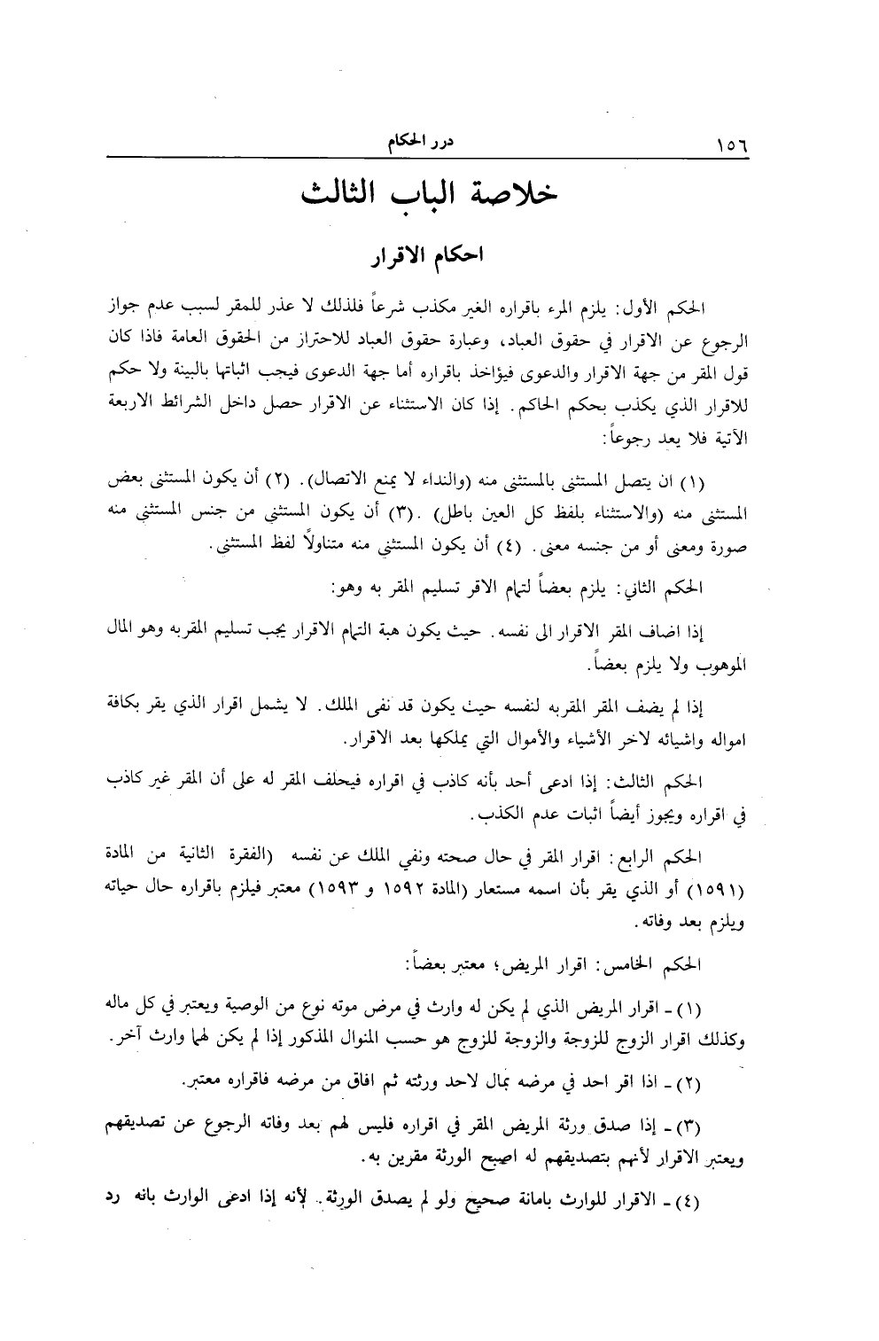 خُلَاصَةُ الْبَابِ الثَّالِثِ أَحْكَامُ الْإِقْرَارِ الْحُكْمُ الْأَوَّلُ: يُلْزَمُ الْمَرْءُ بِإِقْرَارِهِ الْغَيْرِ مُكَذَّبٍ شَرْعًا فَلِذَلِكَ لَا عُذْرَ لِلْمُقِرِّ لِسَبَبِ عَدَمِ جَوَازِ الرُّجُوعِ عَنْ الْإِقْرَارِ فِي حُقُوقِ الْعِبَادِ، وَعِبَارَةُ حُقُوقِ الْعِبَادِ لِلِاحْتِرَازِ مِنْ الْحُقُوقِ الْعَامَّةِ فَإِذَا كَانَ قَوْلُ الْمُقِرِّ مِنْ جِهَةِ الْإِقْرَارِ وَالدَّعْوَى فَيُؤَاخَذُ بِإِقْرَارِهِ أَمَّا جِهَةُ الدَّعْوَى فَيَجِبُ إثْبَاتُهَا بِالْبَيِّنَةِ، وَلَا حُكْمَ لِلْإِقْرَارِ الَّذِي يُكَذَّبُ بِحُكْمِ الْحَاكِمِ.