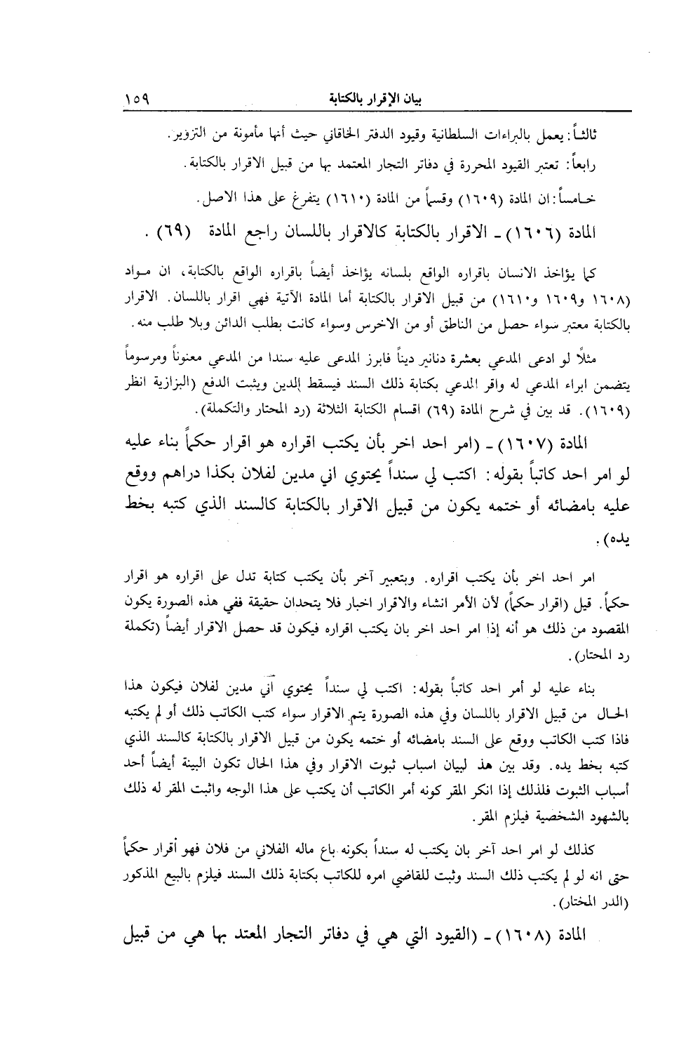 كَمَا يُؤَاخَذُ الْإِنْسَانُ بِإِقْرَارِهِ الْوَاقِعِ بِلِسَانِهِ يُؤَاخَذُ أَيْضًا بِإِقْرَارِهِ الْوَاقِعِ بِالْكِتَابَةِ، إنَّ مَوَادَّ (8 16 وَ 1609 وَ 1610) مِنْ قَبِيلِ الْإِقْرَارِ بِالْكِتَابَةِ أَمَّا الْمَادَّةُ الْآتِيَةُ فَهِيَ إقْرَارٌ بِاللِّسَانِ.