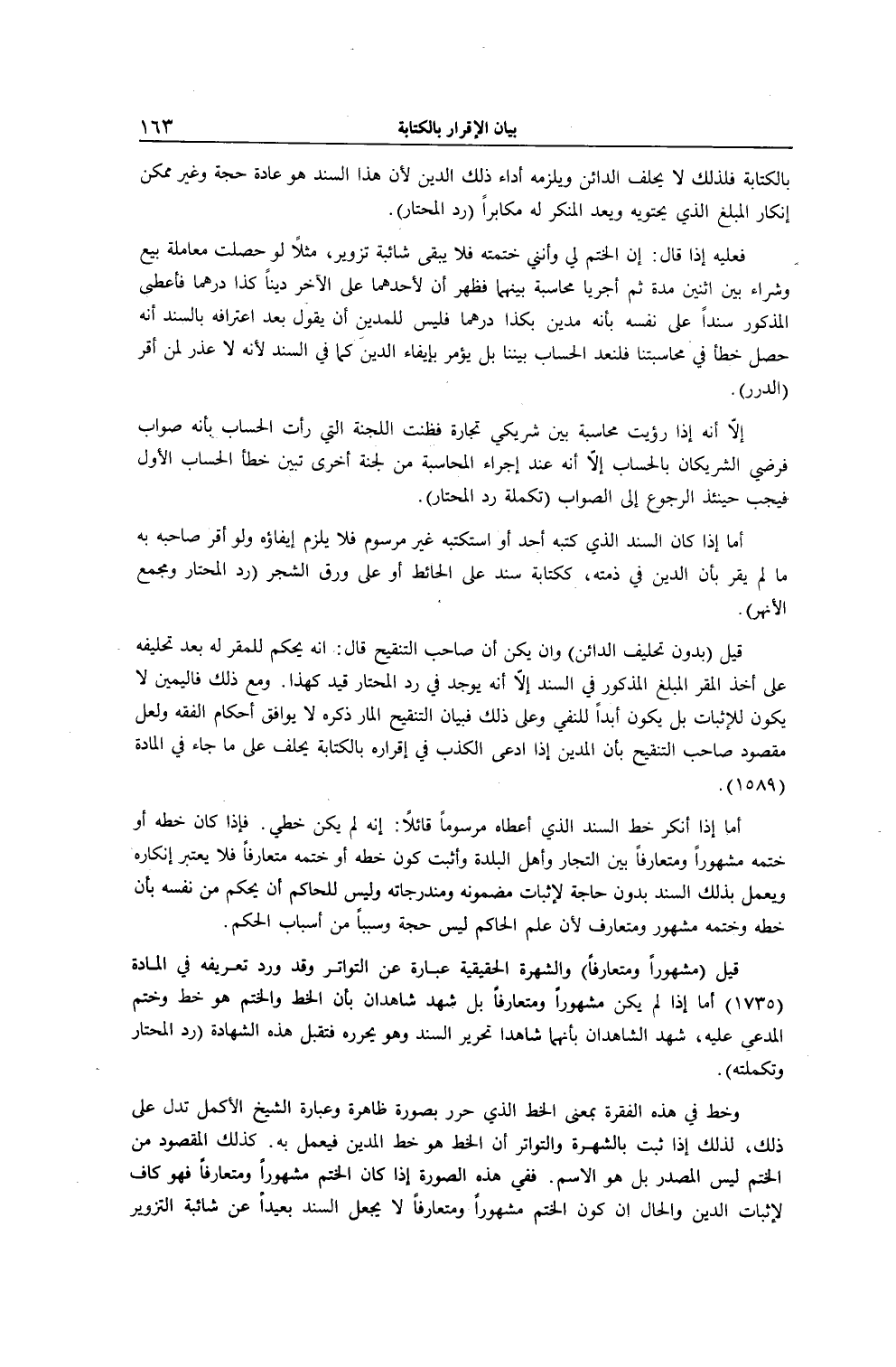 بِالْكِتَابَةِ فَلِذَلِكَ لَا يَحْلِفُ الدَّائِنُ، وَيَلْزَمُهُ أَدَاءُ ذَلِكَ الدَّيْنِ؛ لِأَنَّ هَذَا السَّنَدَ هُوَ عَادَةً حُجَّةٌ، وَغَيْرُ مُمْكِنٍ إنْكَارُ الْمَبْلَغِ الَّذِي يَحْتَوِيهِ وَيُعَدُّ الْمُنْكِرُ لَهُ مُكَابِرًا (رَدُّ الْمُحْتَارِ) .
