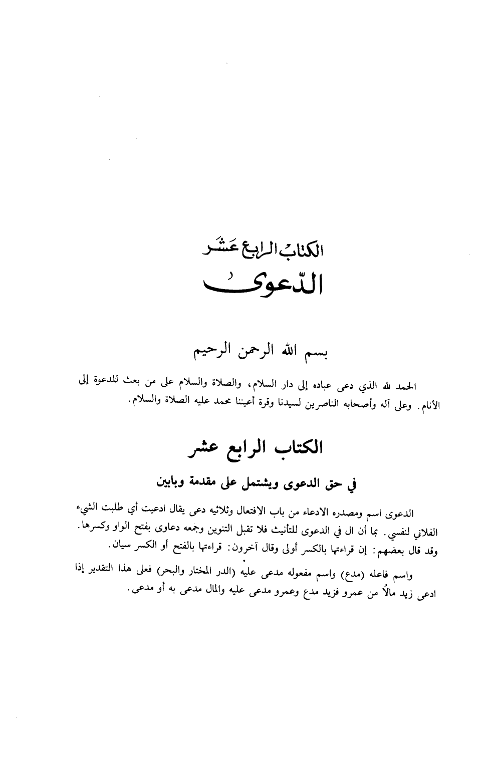 الْكِتَابُ الرَّابِعَ عَشَرَ فِي حَقِّ الدَّعْوَى، وَيَشْتَمِلُ عَلَى مُقَدَّمَةٍ وَبَابَيْنِ الدَّعْوَى اسْمٌ، وَمَصْدَرُهُ الِادِّعَاءُ مِنْ بَابِ الِافْتِعَالِ وَثُلَاثِيُّهُ دَعَا يُقَالُ: ادَّعَيْتُ أَيْ طَلَبْتُ الشَّيْءَ الْفُلَانِيَّ لِنَفْسِي.