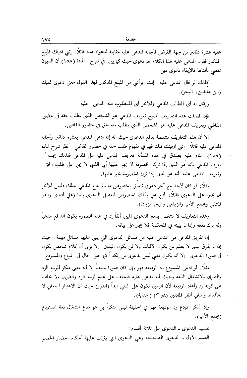 وَهَذِهِ التَّعَارِيفُ لَا تُنْتَقَضُ بِدَفْعِ الدَّعْوَى الْمُبَيَّنِ آنِفًا إذْ فِي هَذِهِ الصُّورَةِ يَكُونُ الدَّافِعُ مُدَّعِيًا، وَلَهُ تَرْكُ دَفْعِهِ، وَإِذَا لَمْ يُبَيِّنْهُ فِي الْمَحْكَمَةِ فَلَا يُجْبَرُ عَلَى بَيَانِهِ.