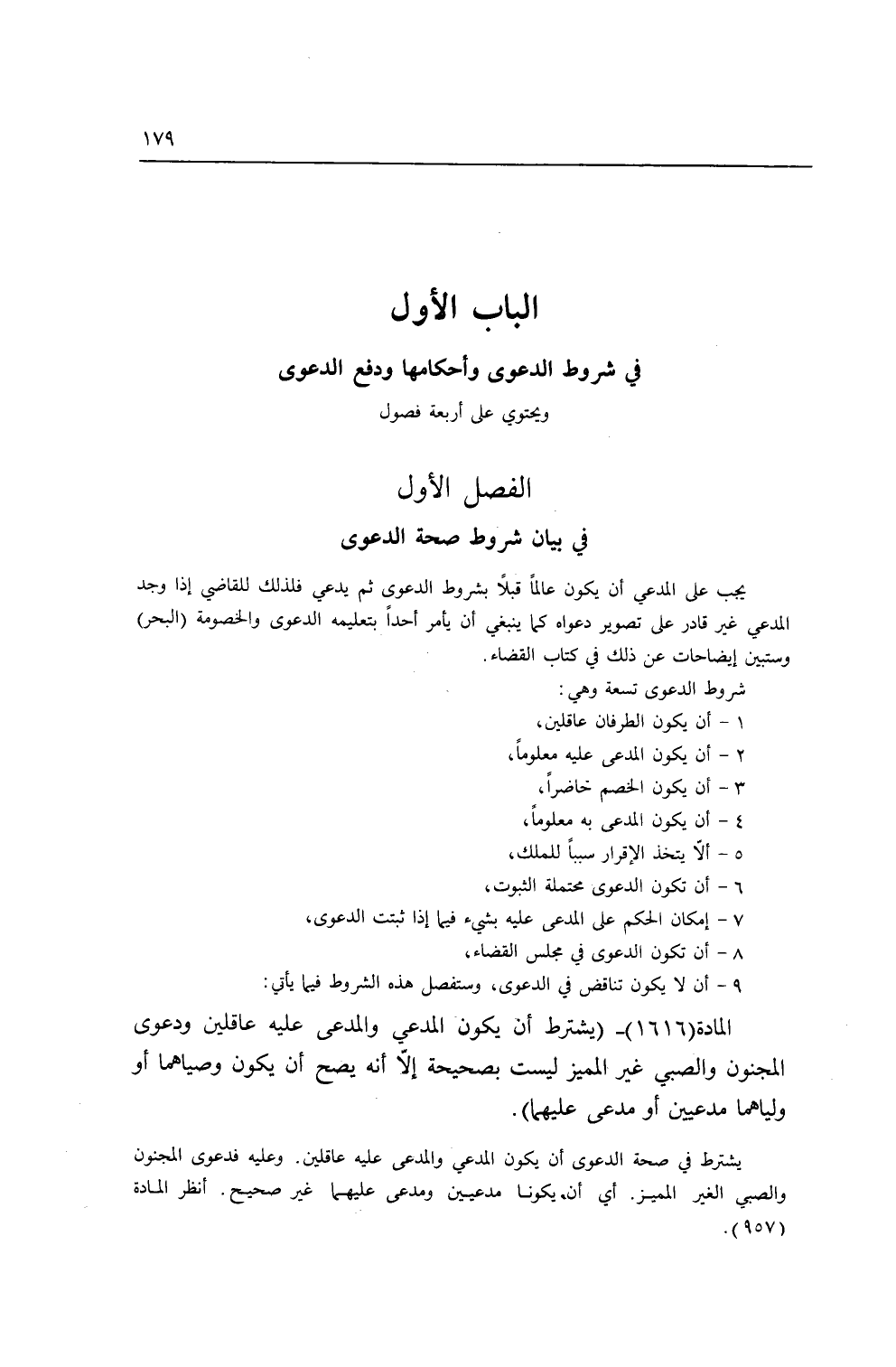 1 - أَنْ يَكُونَ الطَّرَفَانِ عَاقِلَيْنِ 2 - أَنْ يَكُونَ الْمُدَّعَى عَلَيْهِ مَعْلُومًا 3 - أَنْ يَكُونَ الْخَصْمُ حَاضِرًا 4 - أَنْ يَكُونَ الْمُدَّعَى بِهِ مَعْلُومًا 5 - أَلَا يُتَّخَذُ الْإِقْرَارُ سَبَبًا لِلْمِلْكِ 6 - أَنْ تَكُونَ الدَّعْوَى مُحْتَمَلَةَ الثُّبُوتِ 7 - إمْكَانُ الْحُكْمِ عَلَى الْمُدَّعَى عَلَيْهِ بِشَيْءٍ فِيمَا إذَا ثَبَتَتْ الدَّعْوَى 8 - أَنْ تَكُونَ الدَّعْوَى فِي مَجْلِسِ الْقَضَاءِ 9 - أَنْ لَا يَكُونَ تَنَاقُضٌ فِي الدَّعْوَى، وَسَتُفَصَّلُ هَذِهِ الشُّرُوطُ فِيمَا يَأْتِي:.