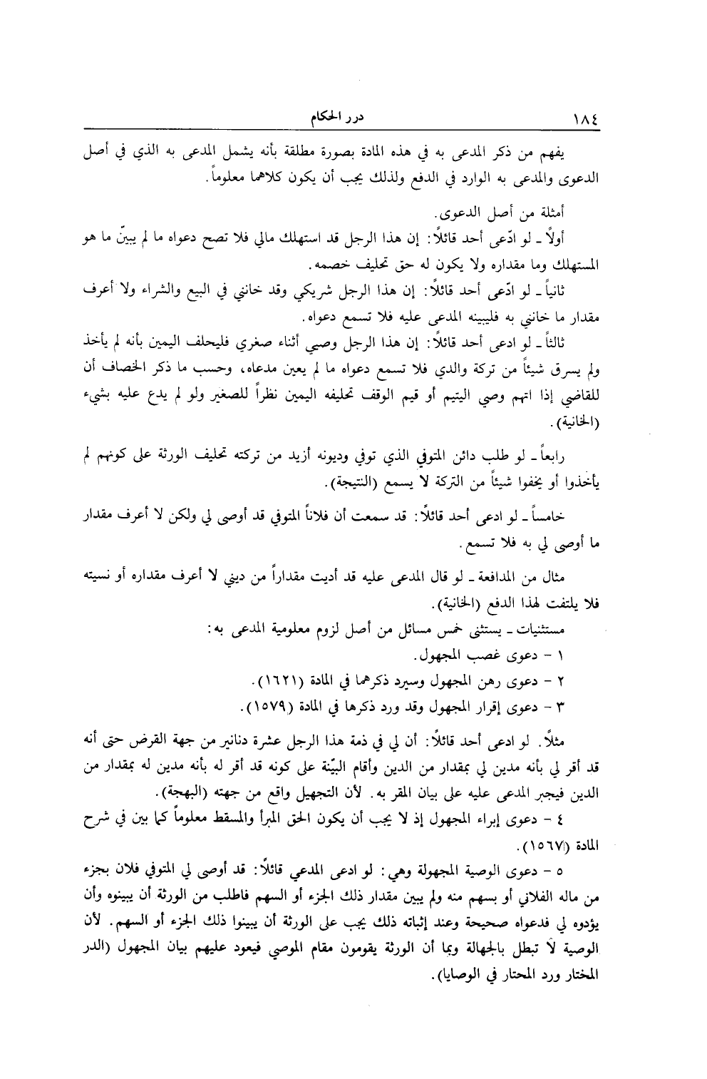 5 - دَعْوَى الْوَصِيَّةِ الْمَجْهُولَةِ وَهِيَ: لَوْ ادَّعَى الْمُدَّعِي قَائِلًا: قَدْ أَوْصَى لِي الْمُتَوَفَّى فُلَانٌ بِجُزْءٍ مِنْ مَالِهِ الْفُلَانِيِّ، أَوْ بِسَهْمٍ مِنْهُ، وَلَمْ يُبَيِّنْ مِقْدَارَ ذَلِكَ الْجُزْءِ أَوْ السَّهْمِ فَأَطْلُبُ مِنْ الْوَرَثَةِ أَنْ يُبَيِّنُوهُ وَأَنْ يُؤَدُّوهُ لِي فَدَعْوَاهُ صَحِيحَةٌ وَعِنْدَ إثْبَاتِهِ ذَلِكَ يَجِبُ عَلَى الْوَرَثَةِ أَنْ يُبَيِّنُوا ذَلِكَ الْجُزْءَ، أَوْ السَّهْمَ؛ لِأَنَّ الْوَصِيَّةَ لَا تَبْطُلُ بِالْجَهَالَةِ، وَبِمَا أَنَّ الْوَرَثَةَ يَقُومُونَ مَقَامَ الْمُوصِي فَيَعُودُ عَلَيْهِمْ بَيَانُ الْمَجْهُولِ (الدُّرُّ الْمُخْتَارُ وَرَدُّ الْمُحْتَارِ فِي الْوَصَايَا) .