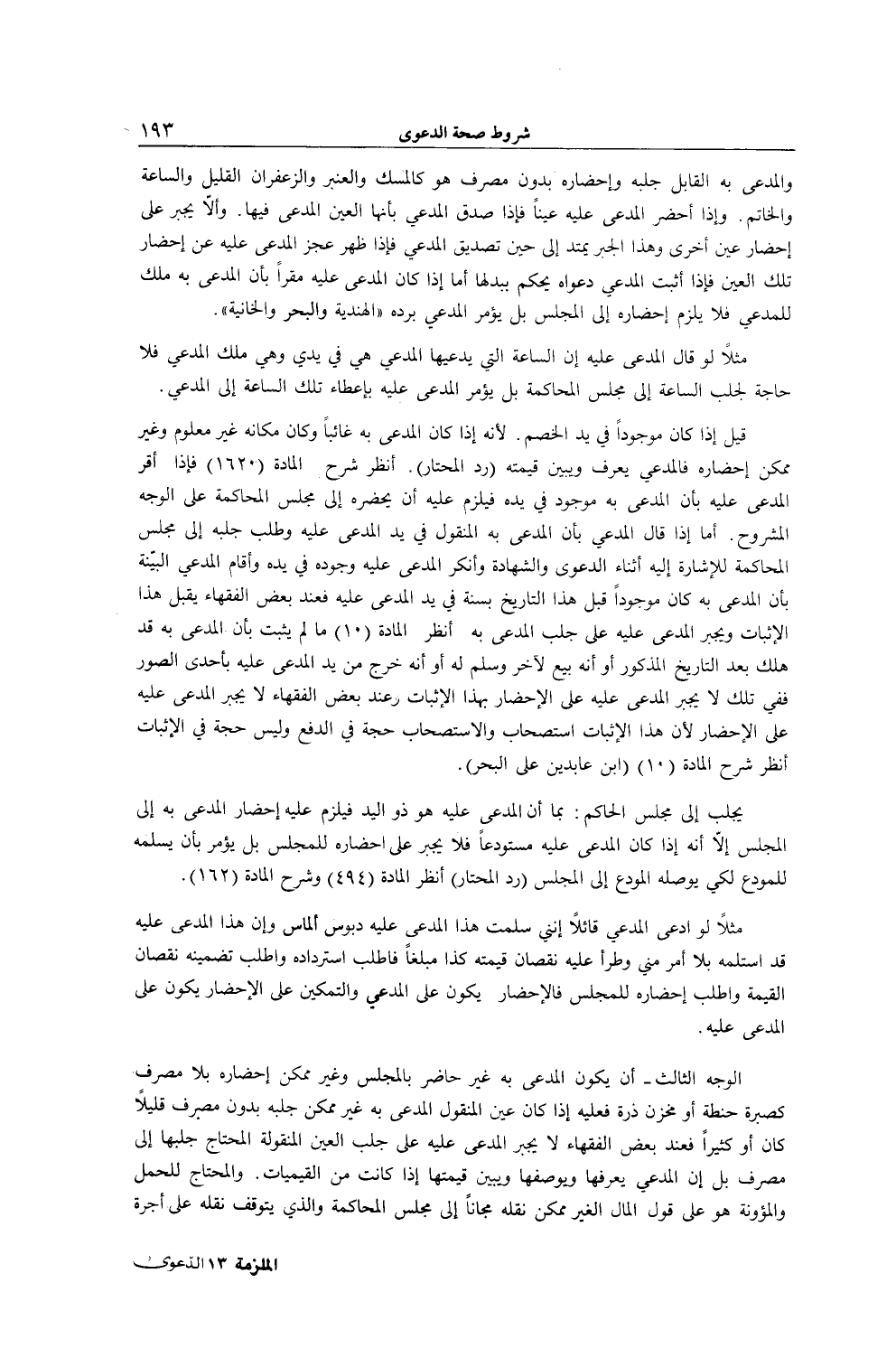 مَثَلًا لَوْ ادَّعَى الْمُدَّعِي قَائِلًا: إنَّنِي سَلَّمْت هَذَا الْمُدَّعَى عَلَيْهِ دَبُّوسَ أَلْمَاسٍ، وَإِنَّ هَذَا الْمُدَّعَى عَلَيْهِ قَدْ اسْتَلَمَهُ بِلَا أَمْرٍ مِنِّي، وَطَرَأَ عَلَيْهِ نُقْصَانُ قِيمَتُهٌ كَذَا مَبْلَغًا فَأَطْلُبُ اسْتِرْدَادَهُ، وَأَطْلُبُ تَضْمِينَهُ نُقْصَانَ الْقِيمَةِ، وَأَطْلُبُ إحْضَارَهُ لِلْمَجْلِسِ فَالْإِحْضَارُ يَكُونُ عَلَى الْمُدَّعِي، وَالتَّمْكِينُ عَلَى الْإِحْضَارِ يَكُونُ عَلَى الْمُدَّعَى عَلَيْهِ.