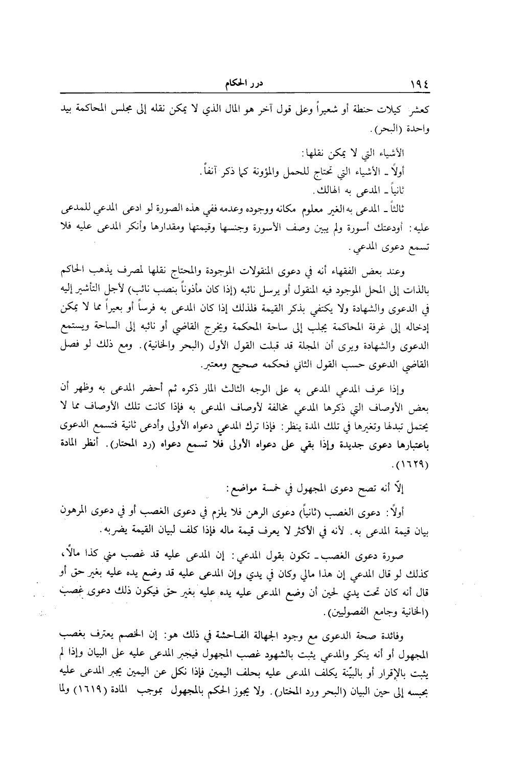 وَإِذَا عَرَّفَ الْمُدَّعِي الْمُدَّعَى بِهِ عَلَى الْوَجْهِ الثَّالِثِ الْمَارِّ ذِكْرُهُ ثُمَّ أَحْضَرَ الْمُدَّعَى بِهِ، وَظَهَرَ أَنَّ بَعْضَ الْأَوْصَافِ الَّتِي ذَكَرَهَا الْمُدَّعِي مُخَالِفَةٌ لِأَوْصَافِ الْمُدَّعَى بِهِ فَإِذَا كَانَتْ تِلْكَ الْأَوْصَافُ مَا لَا يُحْتَمَلُ تَبَدُّلُهَا وَتَغَيُّرُهَا فِي تِلْكَ الْمُدَّةِ يُنْظَرُ: فَإِذَا تَرَكَ الْمُدَّعِي دَعْوَاهُ الْأُولَى وَادَّعَى ثَانِيَةً فَتُسْمَعُ الدَّعْوَى بِاعْتِبَارِهَا دَعْوَى جَدِيدَةً، وَإِذَا بَقِيَ عَلَى دَعْوَاهُ الْأُولَى فَلَا تُسْمَعُ دَعْوَاهُ (رَدُّ الْمُحْتَارِ) .