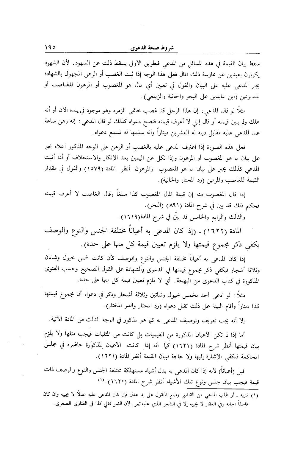 الْمَادَّةُ (1622) - (إذَا كَانَ الْمُدَّعَى بِهِ أَعْيَانَا مُخْتَلِفَةَ الْجِنْسِ وَالنَّوْعِ وَالْوَصْفِ يَكْفِي ذِكْرُ مَجْمُوعِ قِيمَتِهَا، وَلَا يَلْزَمُ تَعْيِينُ قِيمَةِ كُلٍّ مِنْهَا عَلَى حِدَةٍ) .